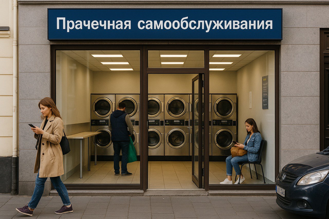 Машины профессионального класса (10–20 кг загрузка), сушки, автоматические дозаторы, терминалы оплаты, видеонаблюдение, wi-fi-зона, минимальное присутствие персонала.