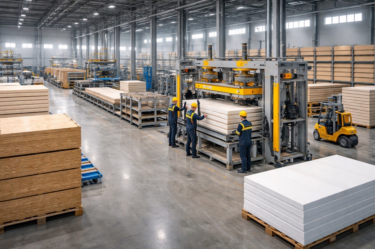 Основная часть бюджета обычно уходит на производственную линию. В зависимости от уровня автоматизации потребуется оборудование для раскроя, прессования, склейки, перемещения и складирования панелей. Для устойчивой работы нужно закладывать средства не только на закупку, но и на монтаж, обслуживание и обучение сотрудников.