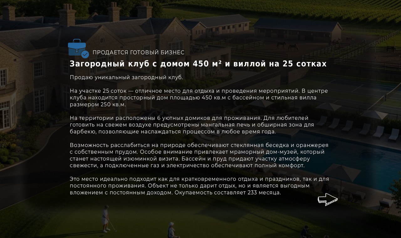 На участке 25 соток — отличное место для отдыха и проведения мероприятий. В центре клуба находится просторный дом площадью 450 кв.м с бассейном и стильная вилла размером 250 кв.м.