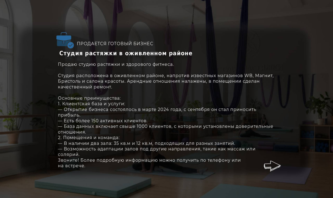 Оставьте заявку на просмотр бизнеса. Мы свяжемся с вами, чтобы подтвердить удобное для вас время и организовать подробную экскурсию с собственником.