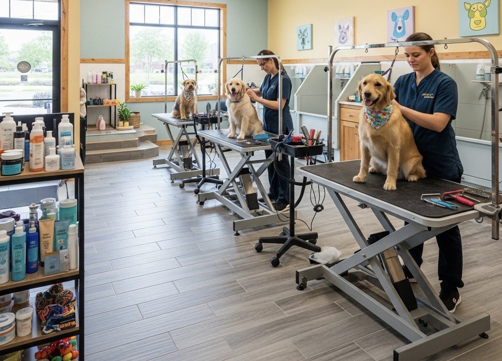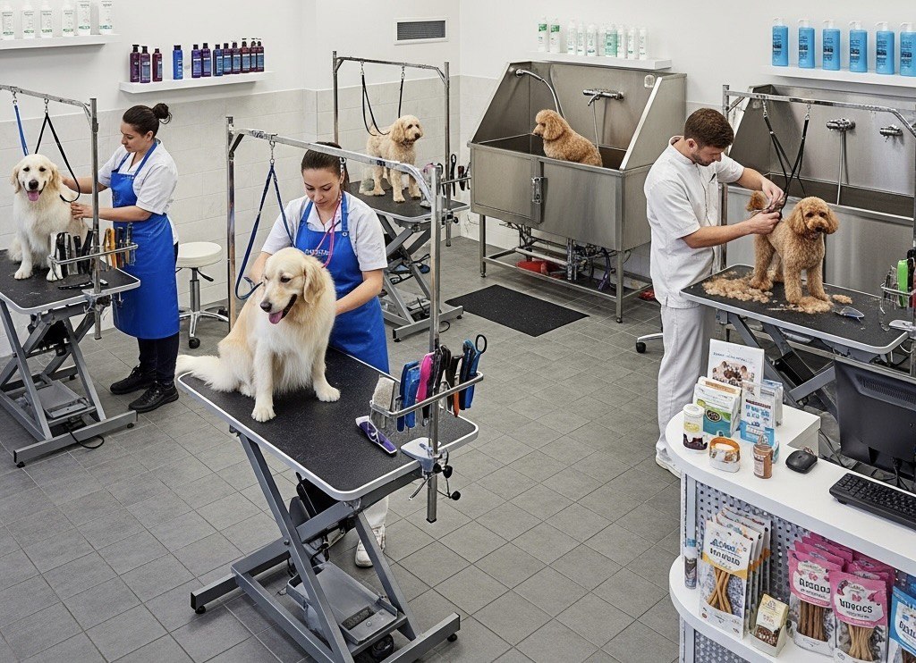 Салон занимает 74 кв.м., что позволяет не только предоставлять груминг-услуги, но и развивать торговую зону. Внутри все оборудовано по последнему слову техники: электроподъемные столы, компрессоры, фены, озоновая ванна и многое другое.