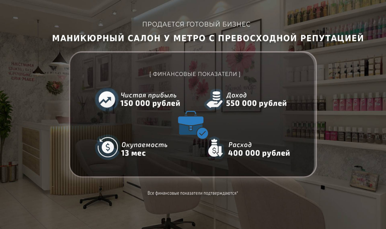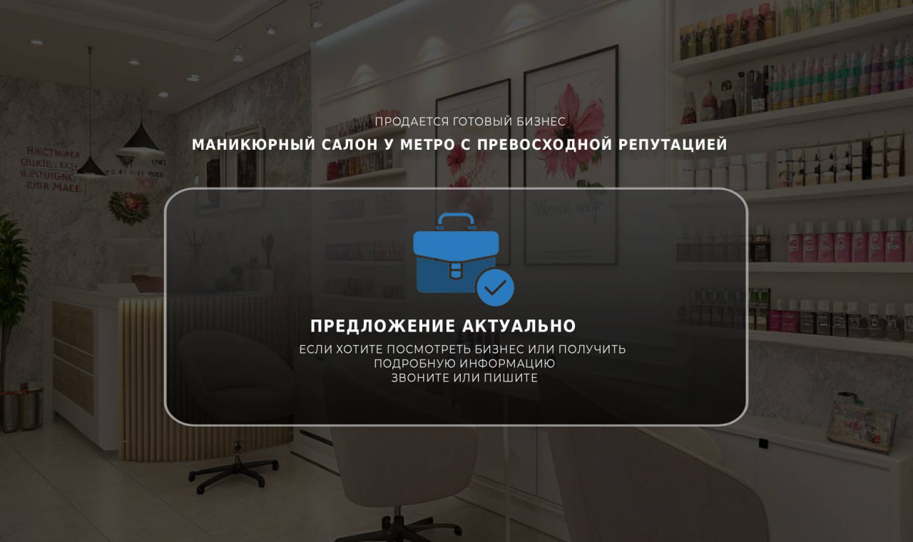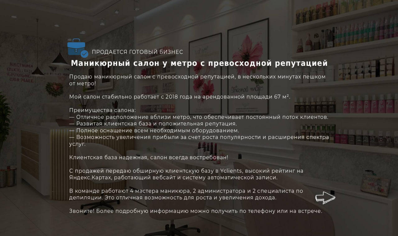 Продаю маникюрный салон с превосходной репутацией, в нескольких минутах пешком от метро!