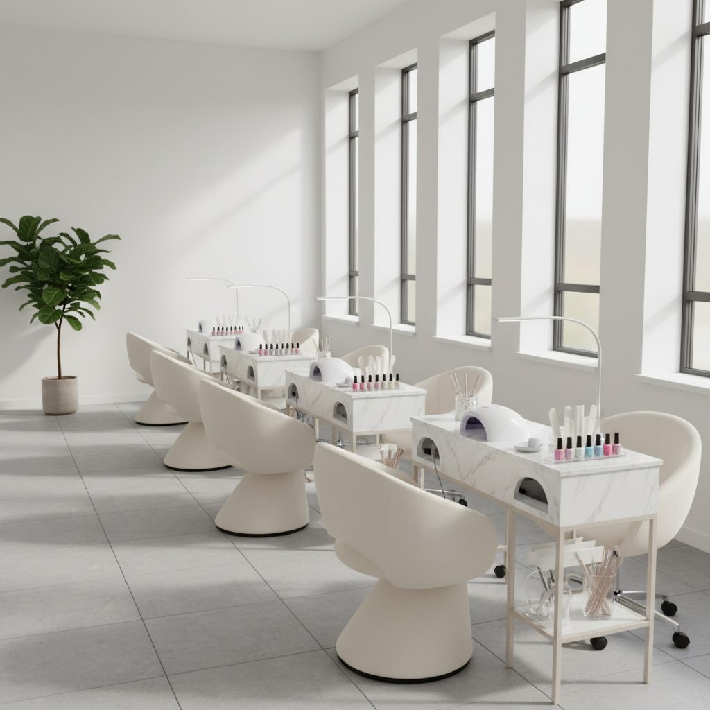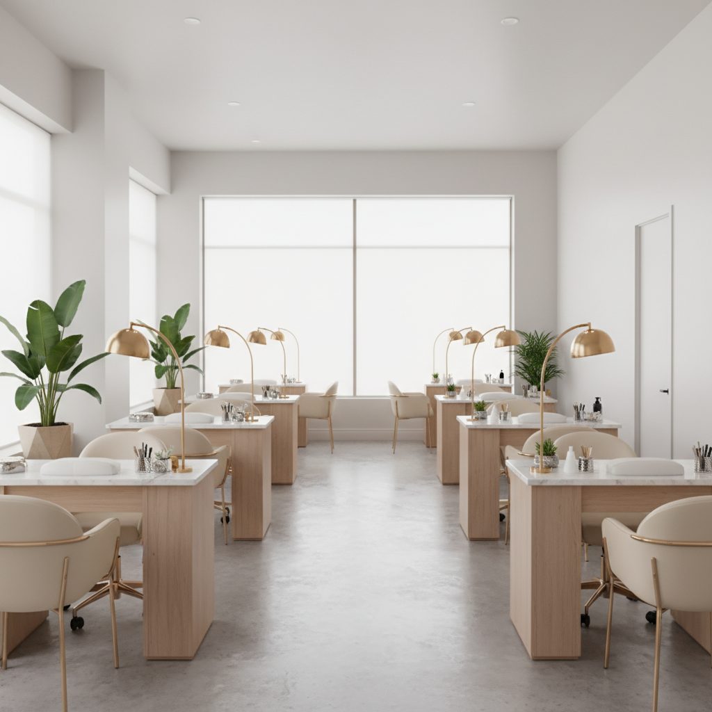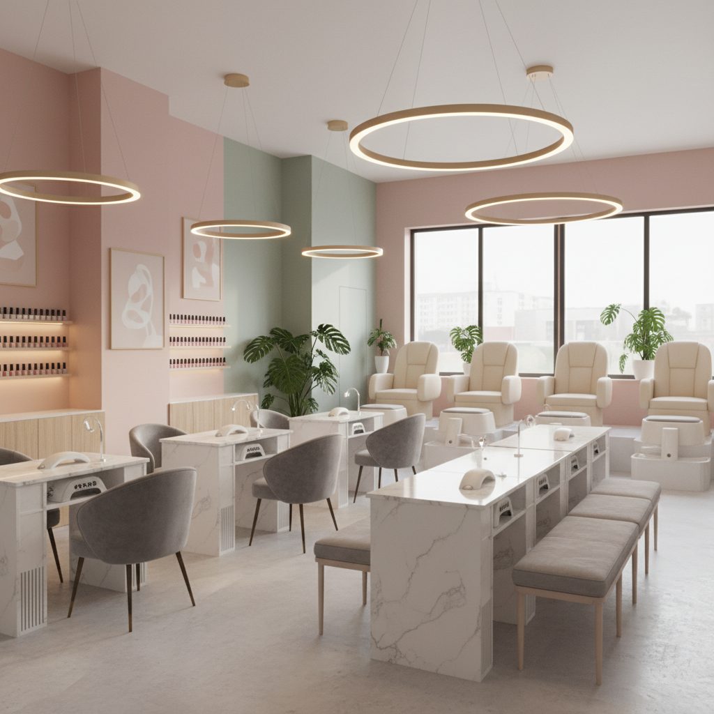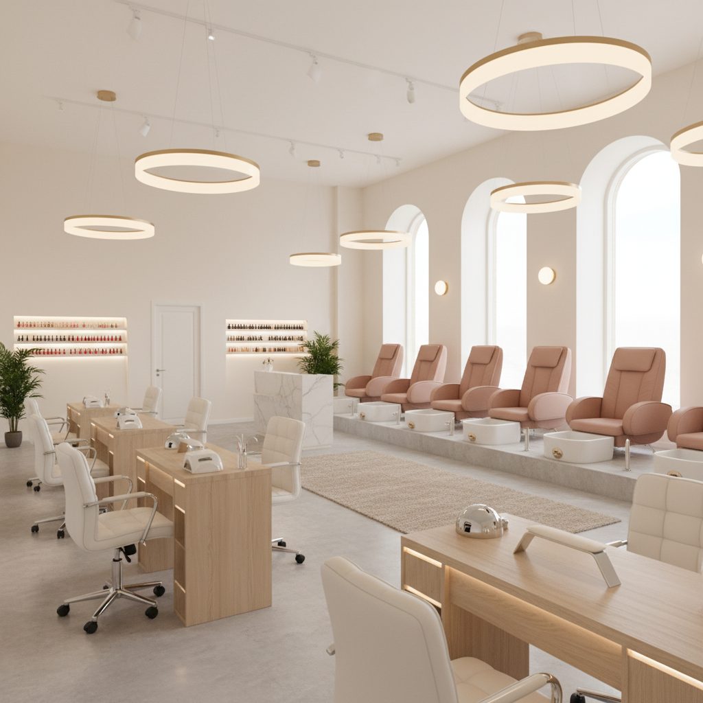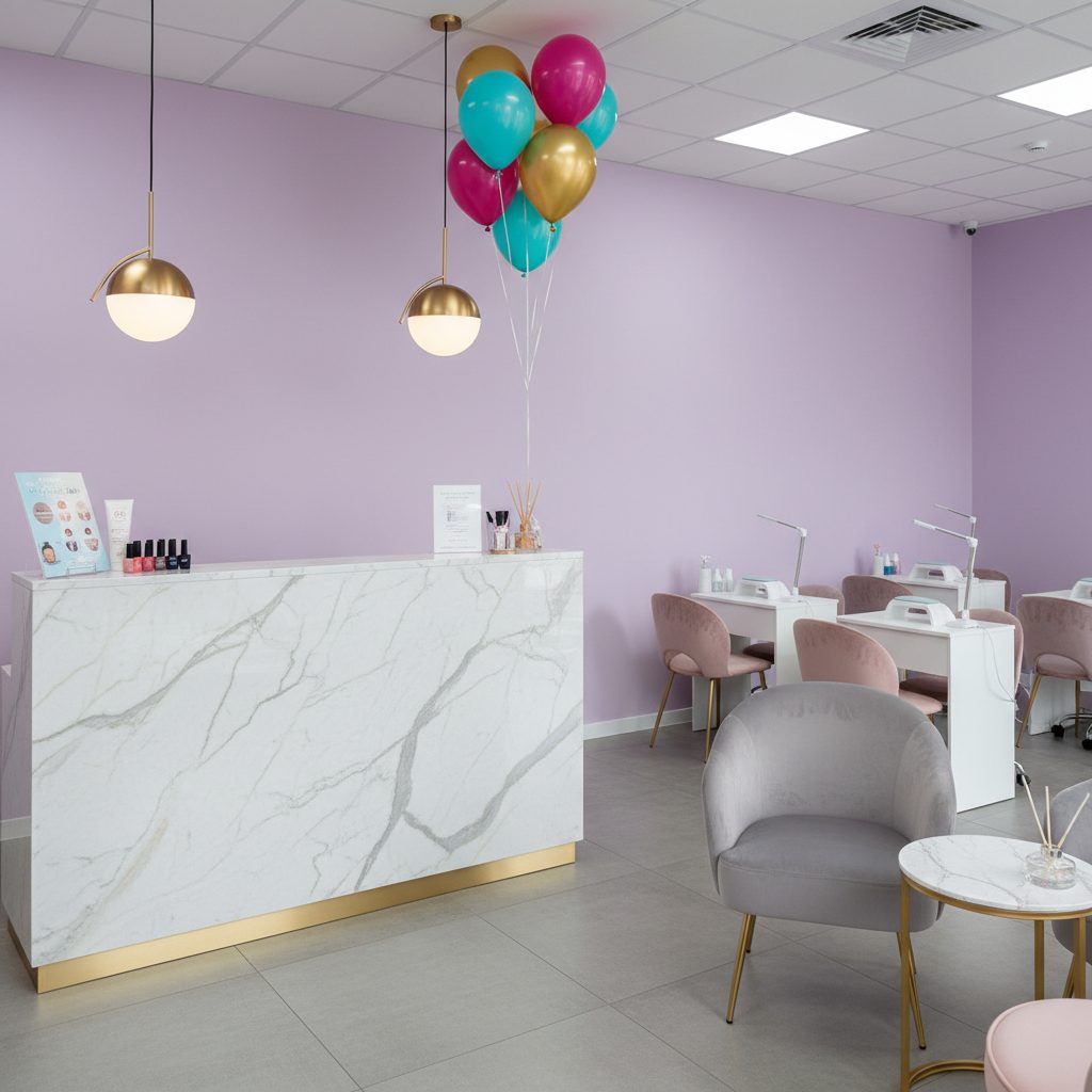 Площадь 65 м², зонирование под студию маникюра, полностью оснащенное оборудование: 8 столов маникюра, 3 педикюрных реклайнера и 1 место бровиста.