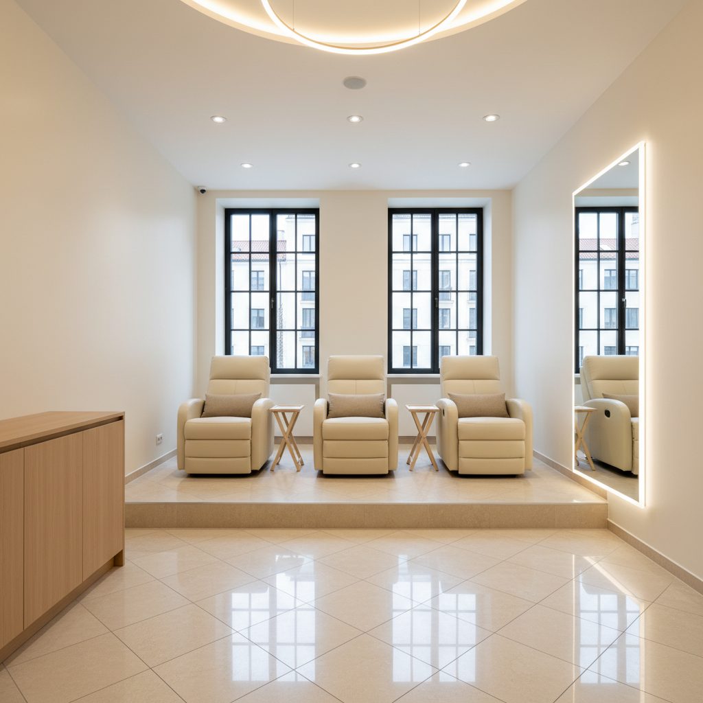 ➤ ПОМЕЩЕНИЕ: Просторное помещение площадью 74 кв.м. в удобной локации. Включает отдельный кабинет для массажа или процедур с ресницами и бровями, комнату для персонала, основной зал на 5 рабочих мест для мастеров маникюра, три педикюрных кресла, место для бровиста и санузел. Всё оборудование и мебель новые, куплены специально для салона.