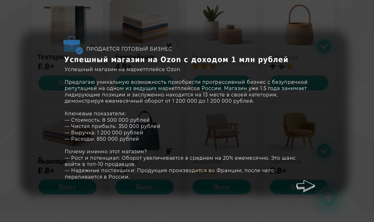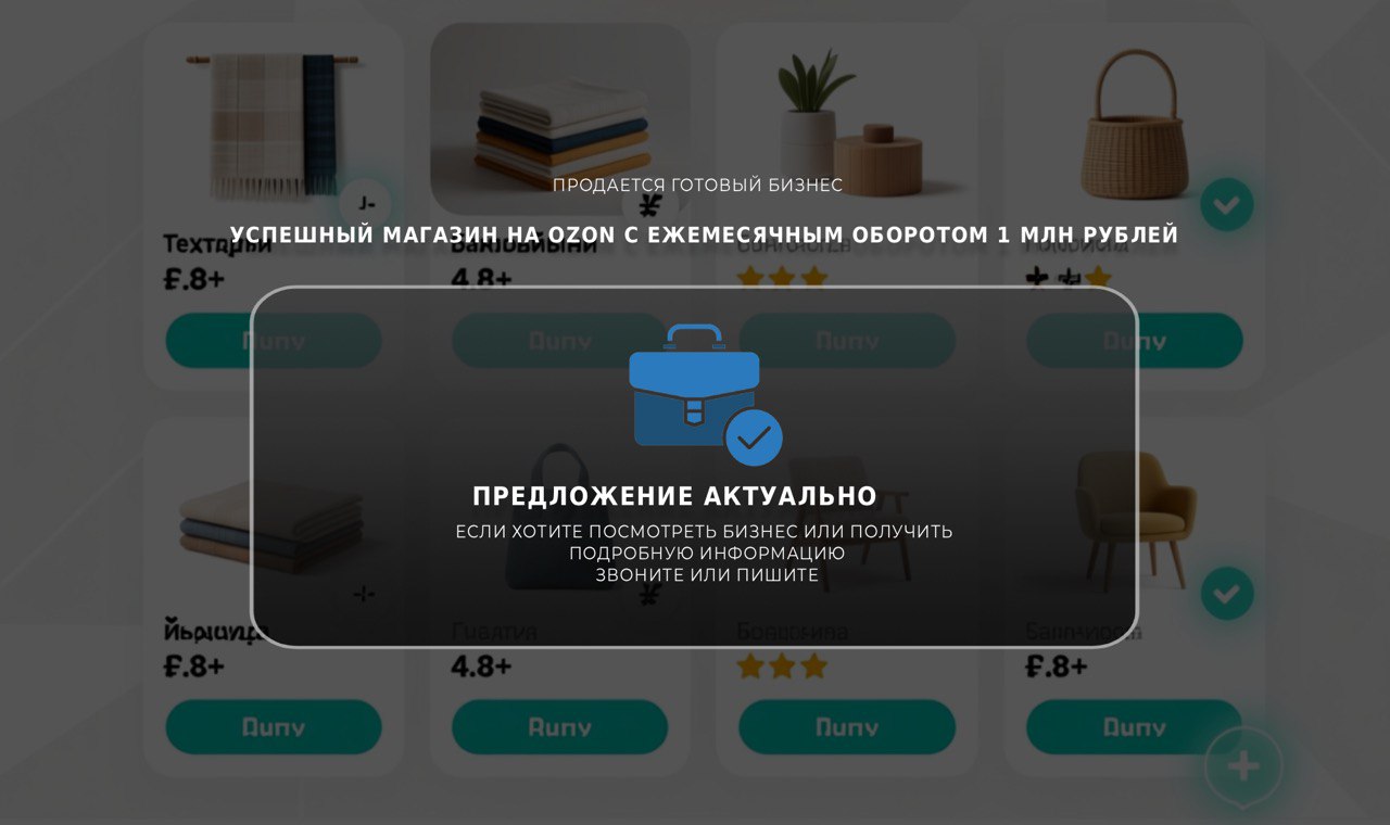 Предлагаю уникальную возможность приобрести прогрессивный бизнес с безупречной репутацией на одном из ведущих маркетплейсов России. Магазин уже 1.5 года занимает лидирующие позиции и заслуженно находится на 13 месте в своей категории, демонстрируя ежемесячный оборот от 1 200 000 до 1 200 000 рублей.