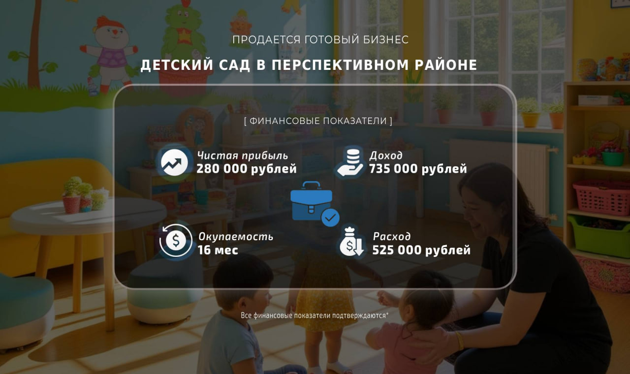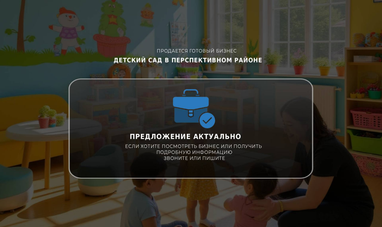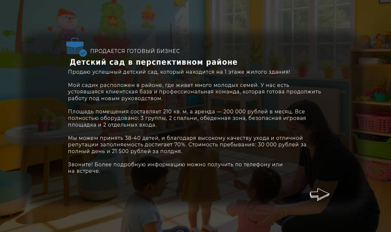 Мой садик расположен в районе, где живет много молодых семей. У нас есть устоявшаяся клиентская база и профессиональная команда, которая готова продолжить работу под новым руководством.