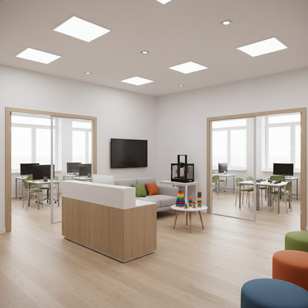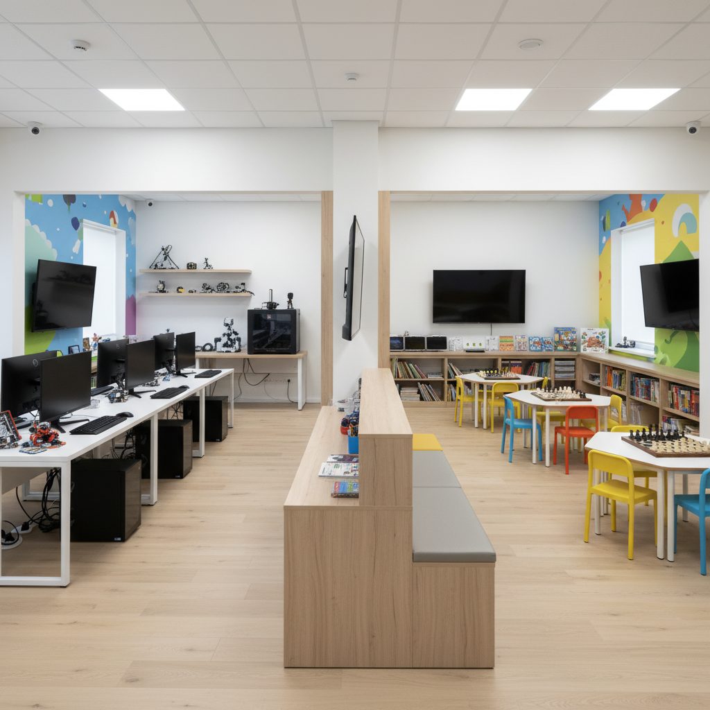 В стоимость входит всё оборудование, включая 3D-принтер, 10 мощных игровых компьютеров, 3 ноутбука, 2 смарт-тв, систему видеонаблюдения и все необходимые материалы для занятий.