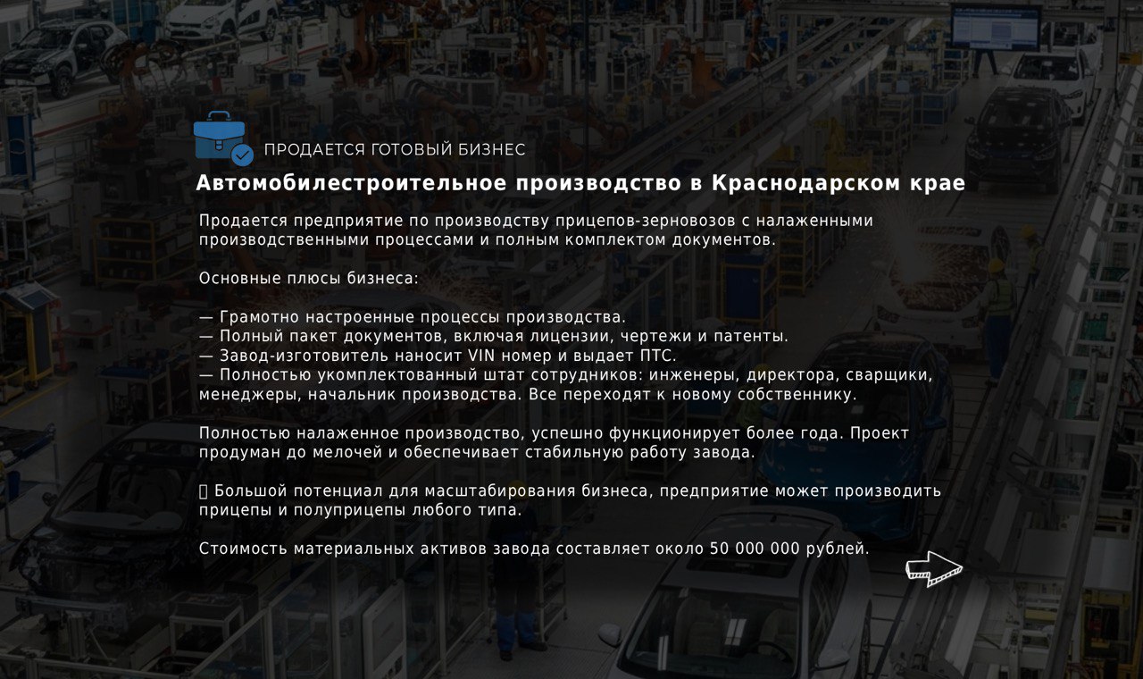Ищете стабильный и прибыльный бизнес в автомобильной индустрии? Тогда это предложение для вас! Продается предприятие по производству прицепов-зерновозов с налаженными производственными процессами и полным комплектом документов.