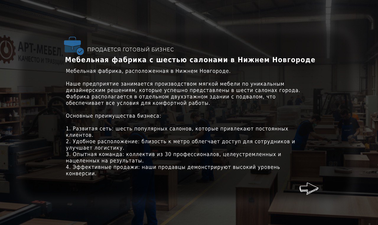 Оставьте заявку на просмотр бизнеса. Мы свяжемся с вами, чтобы подтвердить удобное для вас время и организовать подробную экскурсию с собственником.
