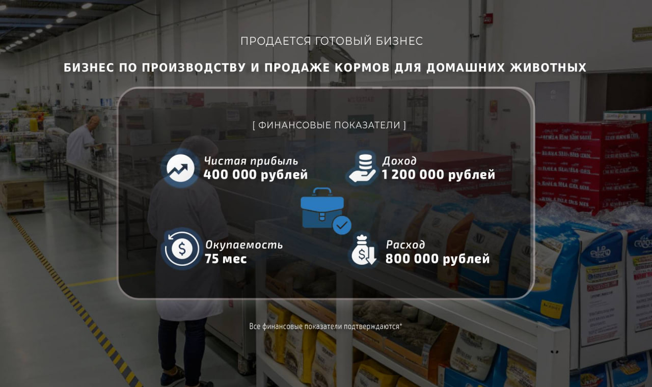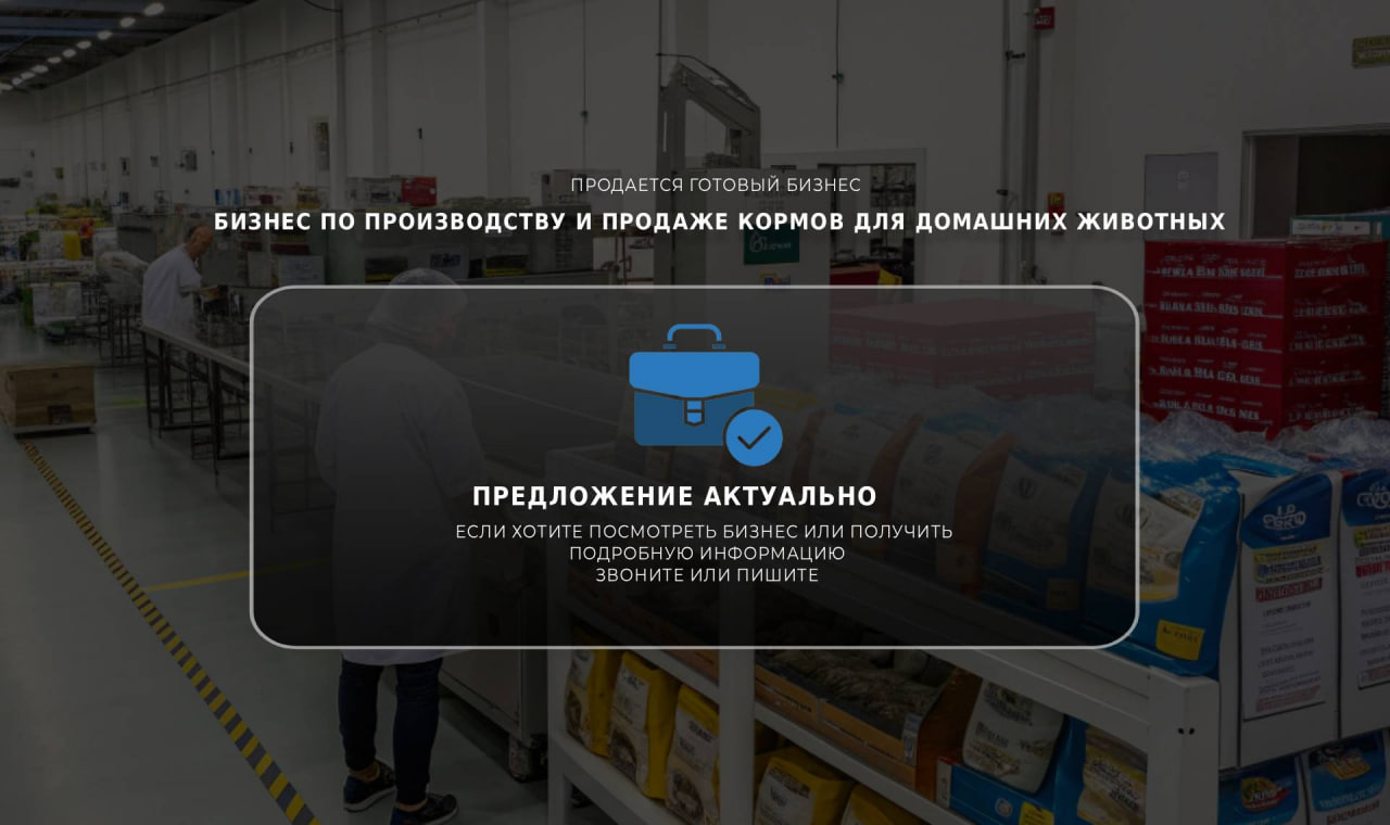 Покупая этот бизнес, вы получаете надежную платформу для успешного развития на рынке кормов для домашних животных.
