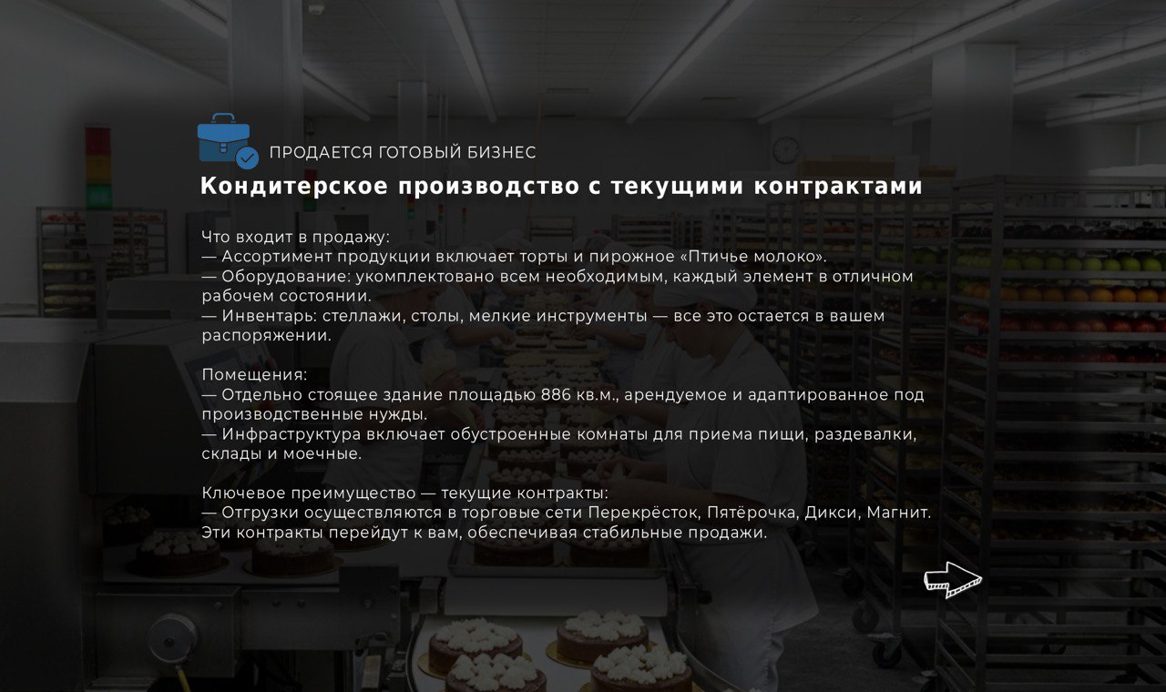 — Отгрузки осуществляются в торговые сети Перекрёсток, Пятёрочка, Дикси, Магнит. Эти контракты перейдут к вам, обеспечивая стабильные продажи.