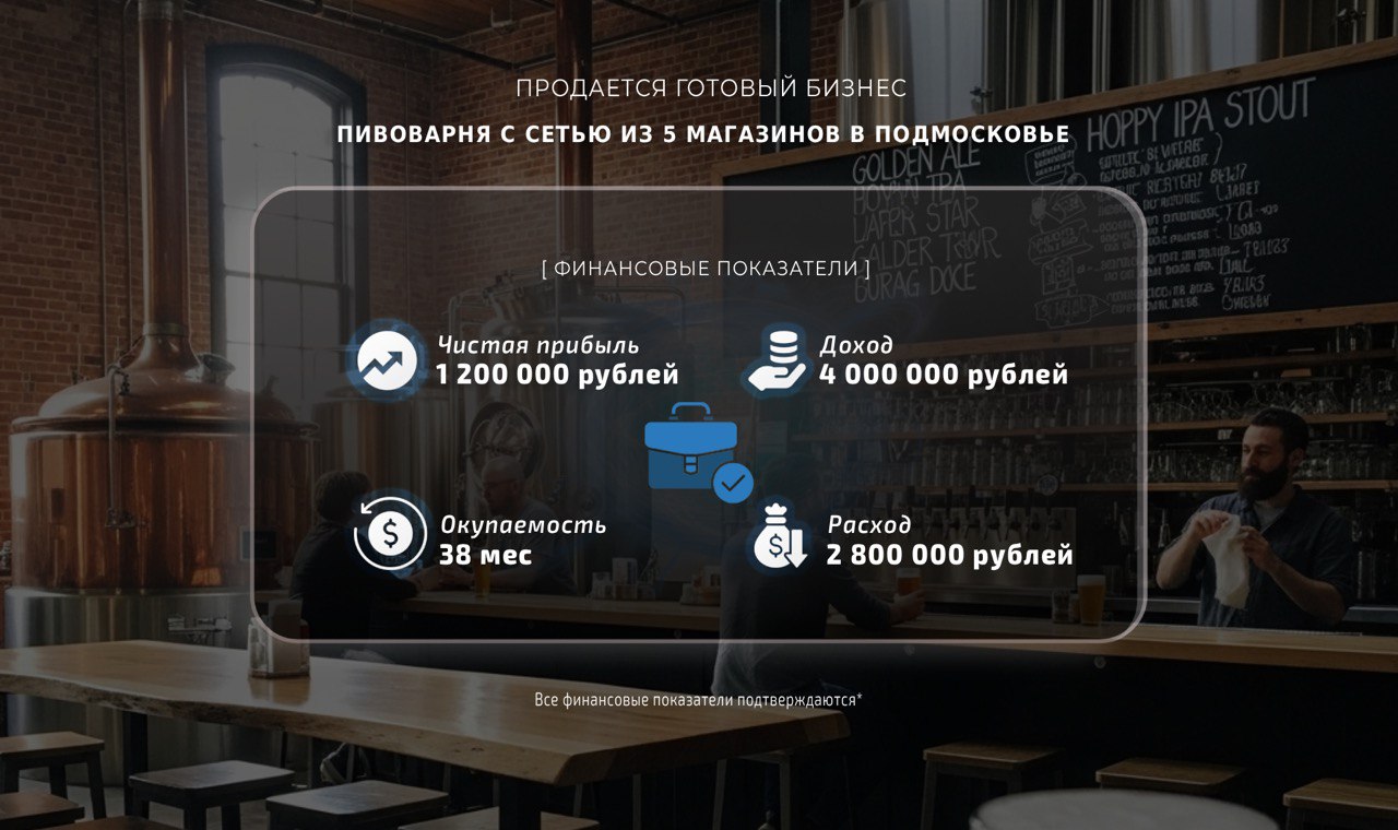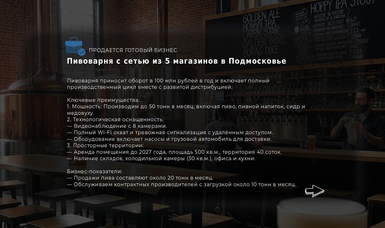 Пивоварня приносит оборот в 100 млн рублей в год и включает полный производственный цикл вместе с развитой дистрибуцией.