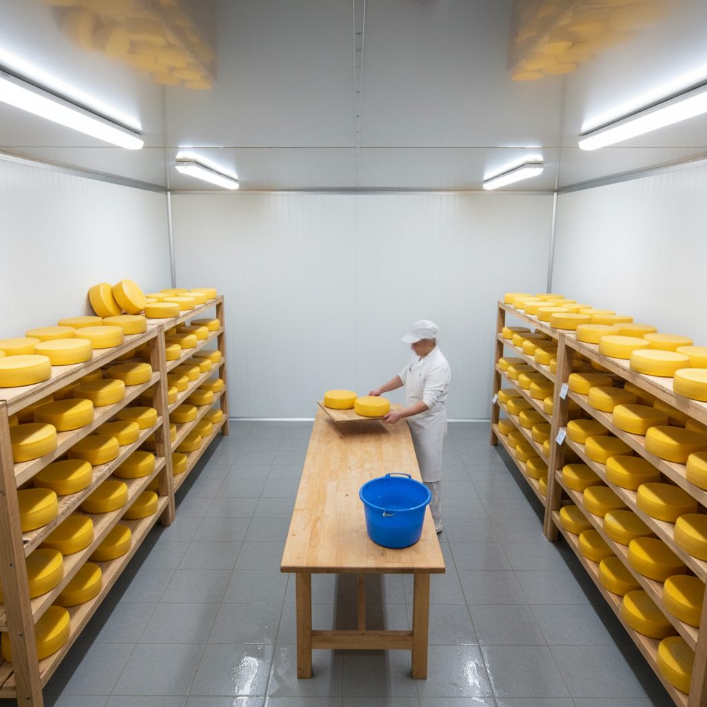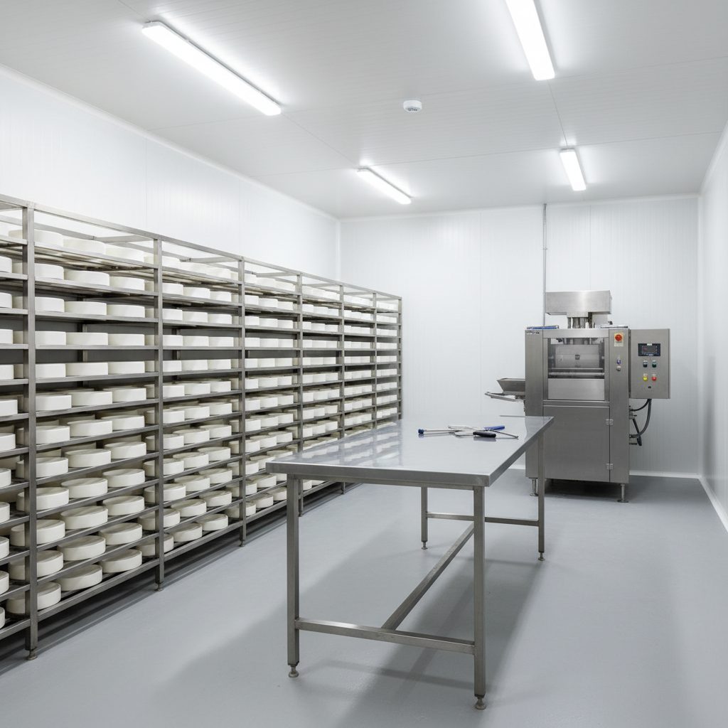 Производство находится всего в 20 км от Москвы, что позволяет снизить затраты на аренду и логистику. Цех площадью 200 кв.м. арендуется в нежилом здании по ставке 65 000 рублей, включает: офис, цех для переработки молока, хранилища для сыров с белой и голубой плесенью, хранилища для твердых и полутвердых сыров, помещение для фасовки и нарезки.