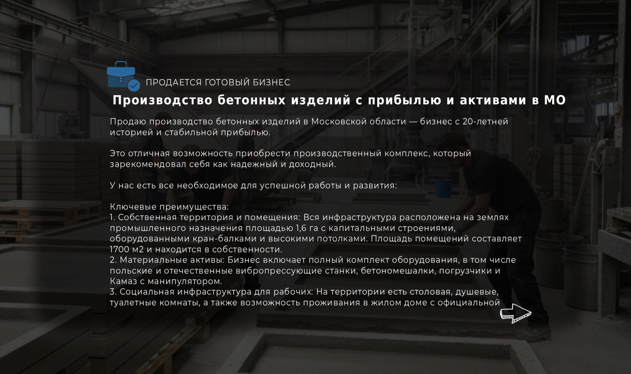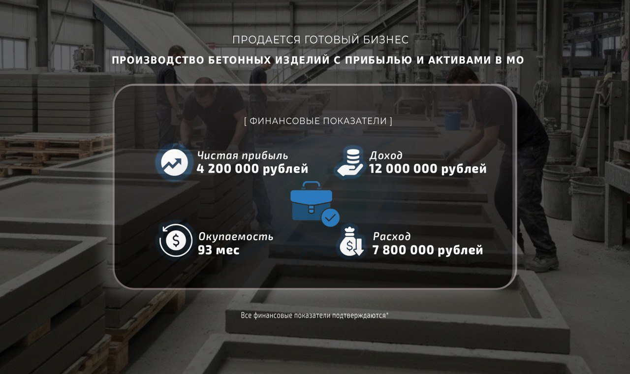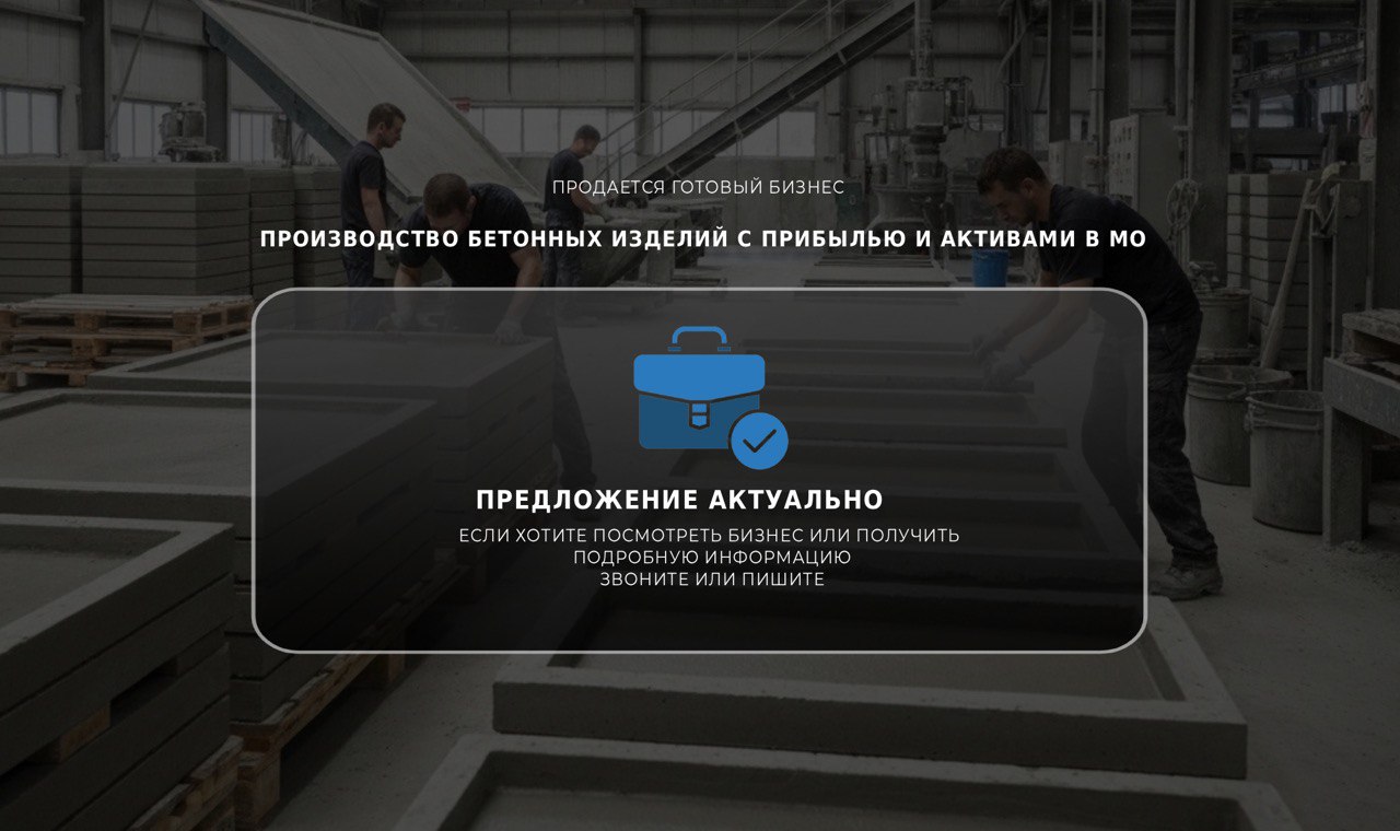 Продаю производство бетонных изделий в Московской области — бизнес с 20-летней историей и стабильной прибылью.
