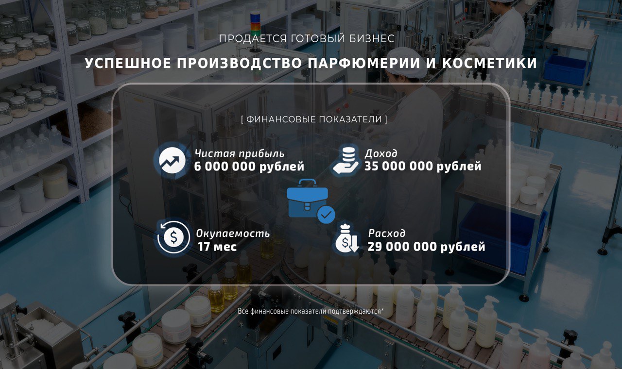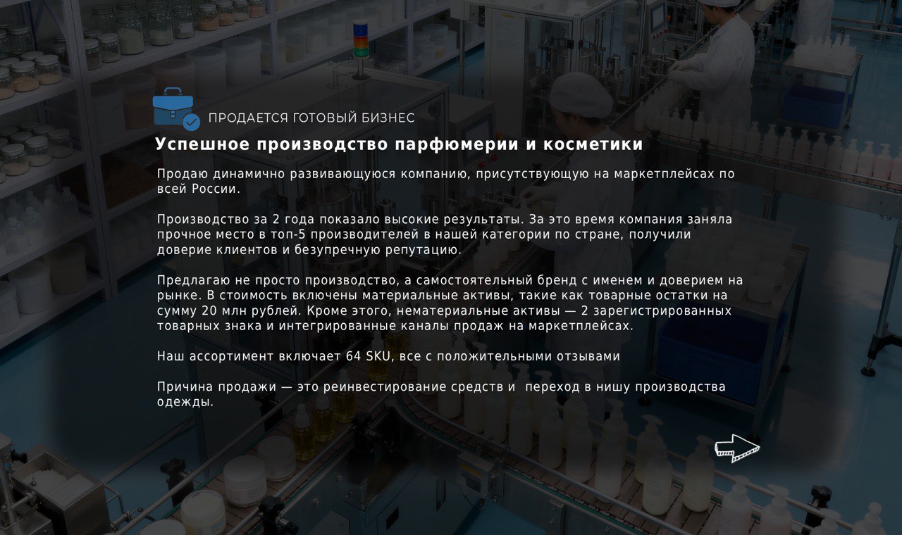 Предлагаю не просто производство, а самостоятельный бренд с именем и доверием на рынке. В стоимость включены материальные активы, такие как товарные остатки на сумму 20 млн рублей. Кроме этого, нематериальные активы — 2 зарегистрированных товарных знака и интегрированные каналы продаж на маркетплейсах.