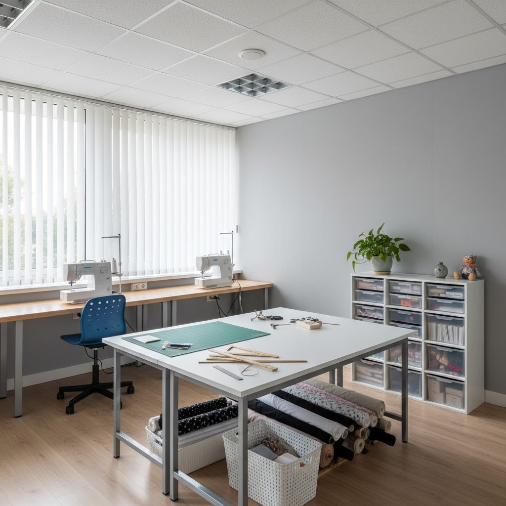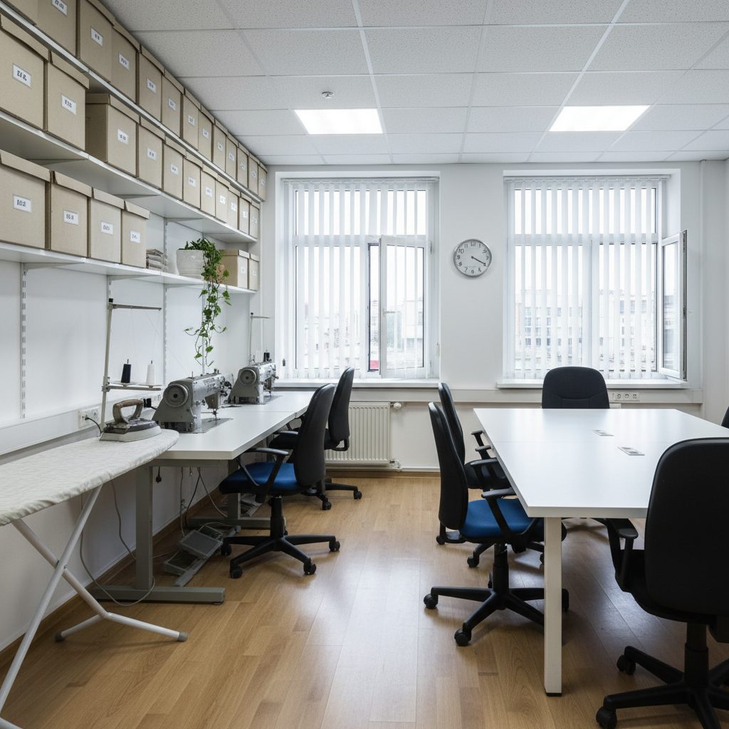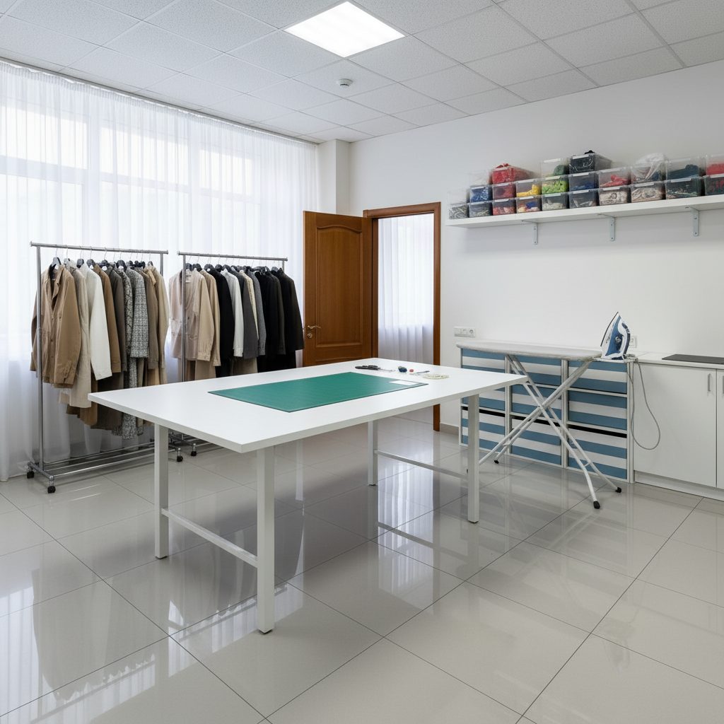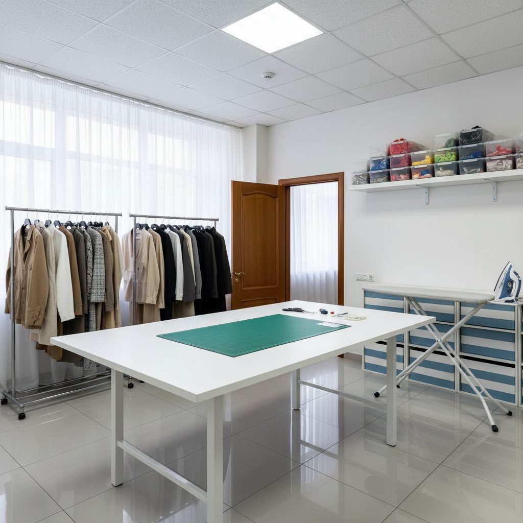 Мастерская расположена в Москве, площадь помещения составляет 30 кв.м. В комплекте профессиональное оборудование: 2 прямострочные машины, пятинитка, крайовочная машина, раскроечный стол длиной 4 метра, 3 электрических ножа (включая беспроводной), гладильная доска с парогенератором и вешалки для одежды.