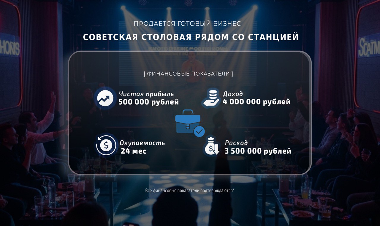 В пакет продажи включено всё необходимое: юридическое лицо с действующей алкогольной лицензией, товарный остаток на сумму 3 000 000 рублей, высококачественное световое и звуковое оборудование, полностью оборудованная кухня и офисное оборудование. База постоянных клиентов из сегмента B2C и B2B обеспечивает стабильный поток гостей, а наши 3 актуальных веб-сайта и маркетинговая система с CRM помогают удерживать и привлекать новых клиентов.