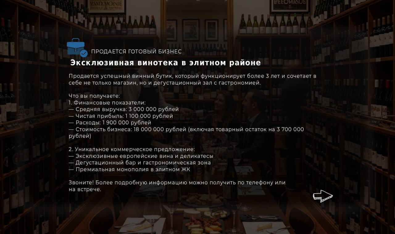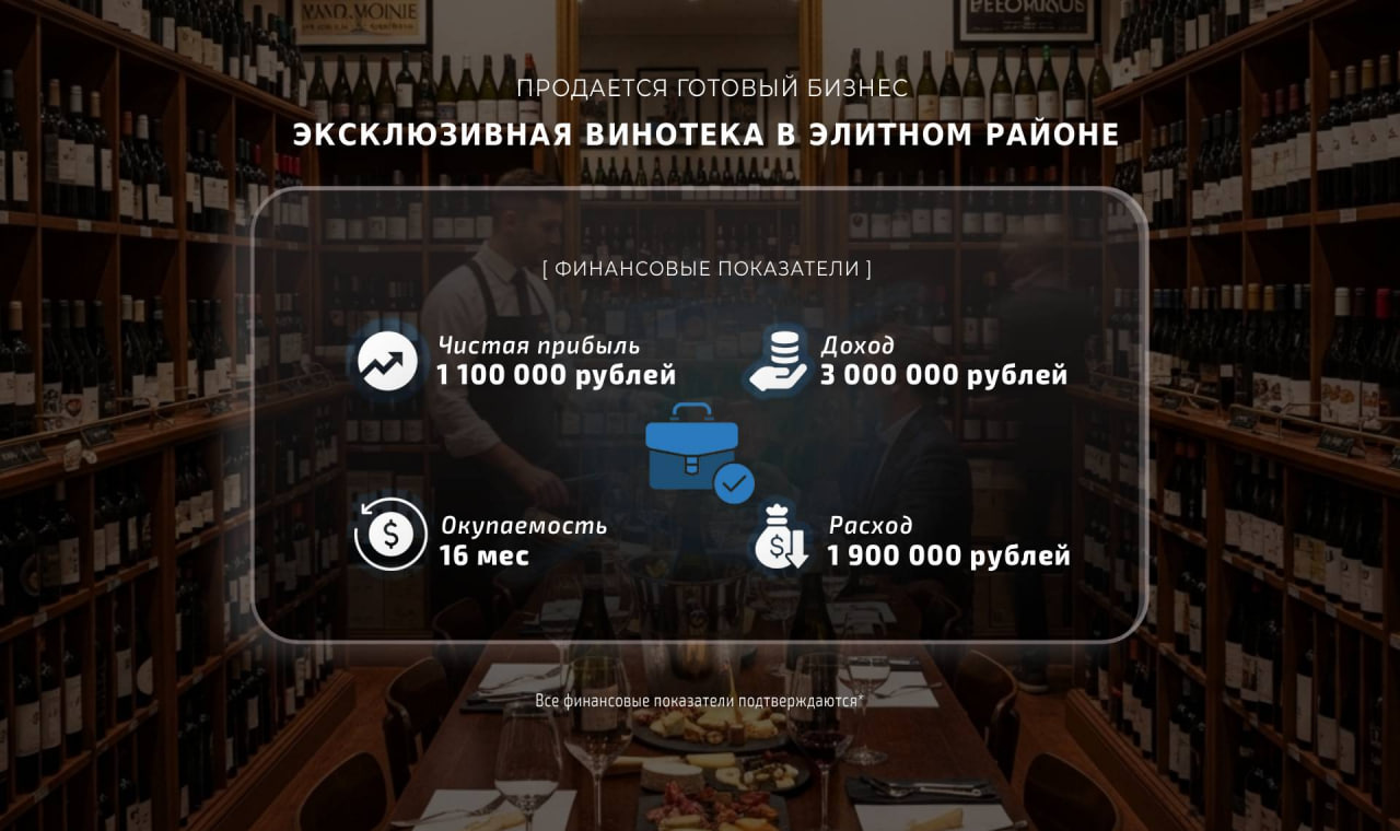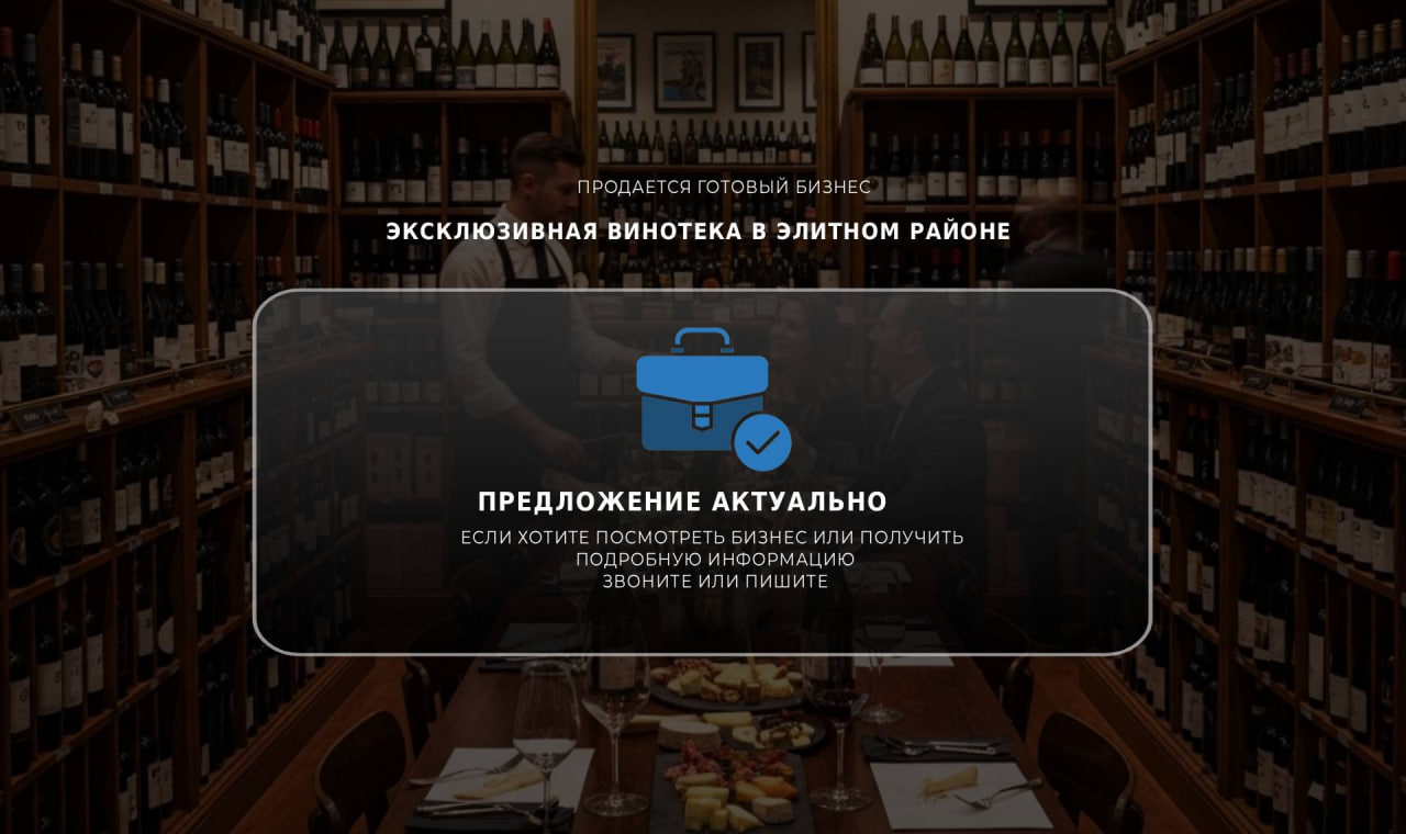 Продается успешный винный бутик, который функционирует более 3 лет и сочетает в себе не только магазин, но и дегустационный зал с гастрономией.