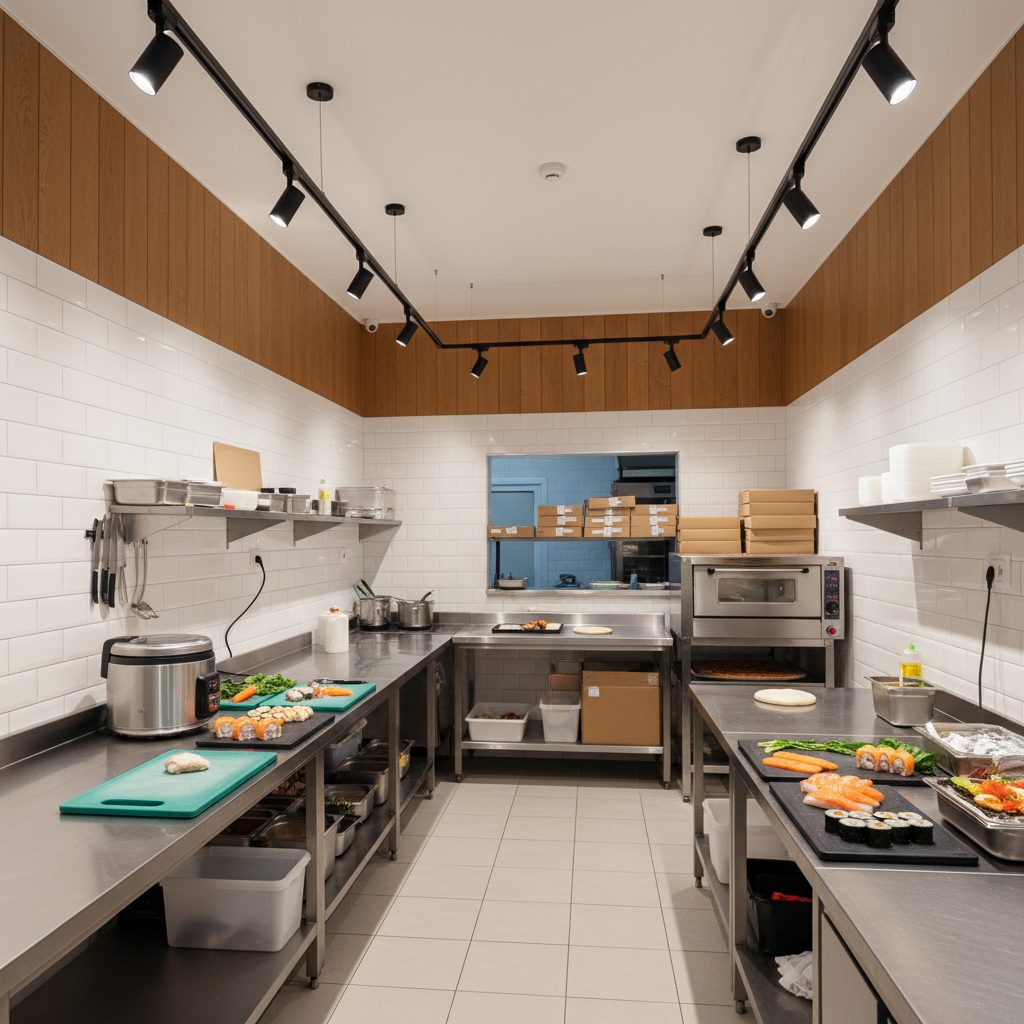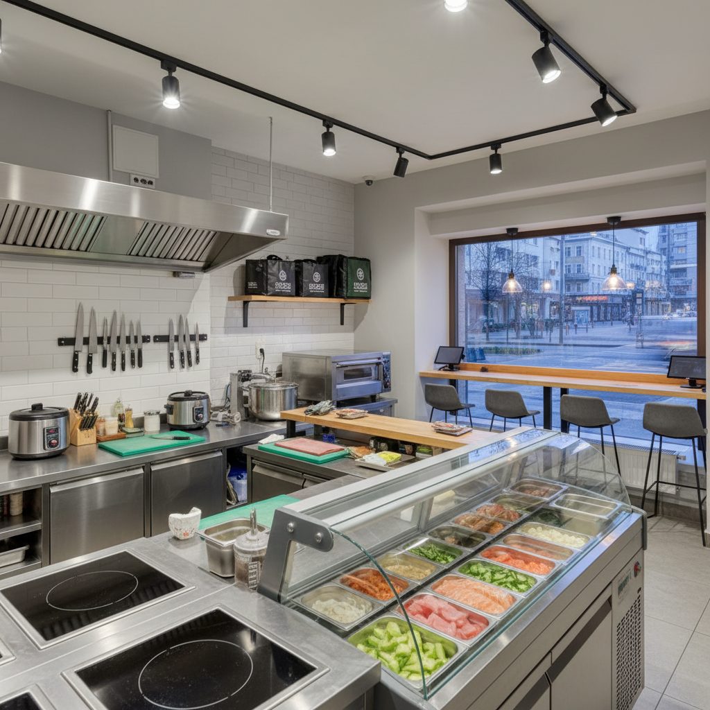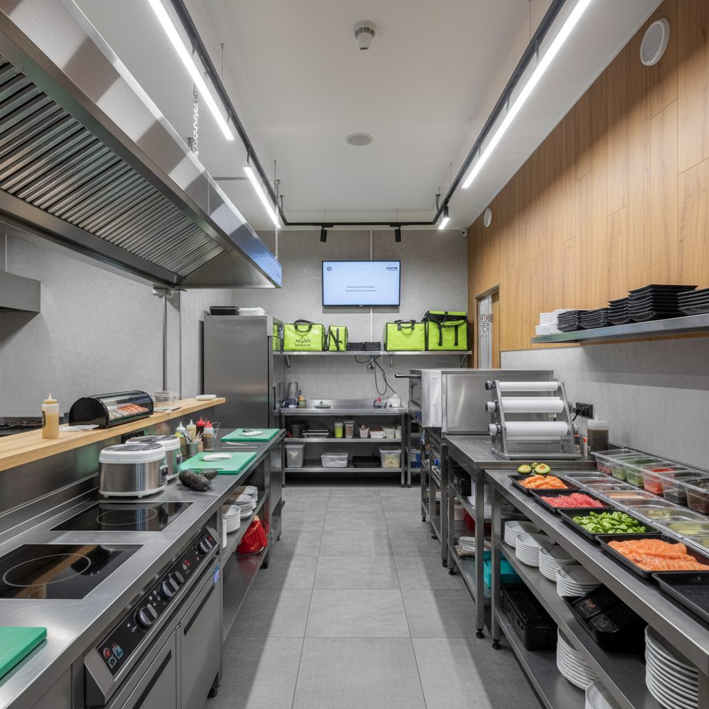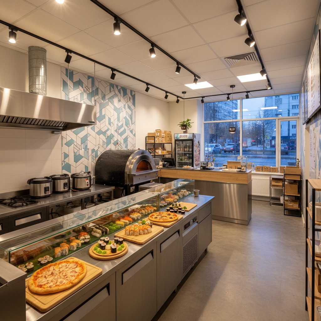 Площадь 48 м², зонирование под общественное питание, полностью укомплектованное оборудование для приготовления суши, роллов и пиццы.
