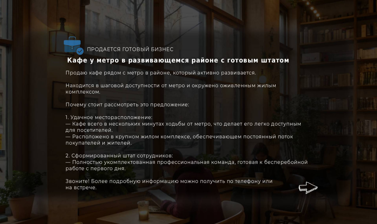 Оставьте заявку на просмотр бизнеса. Мы свяжемся с вами, чтобы подтвердить удобное для вас время и организовать подробную экскурсию с собственником.
