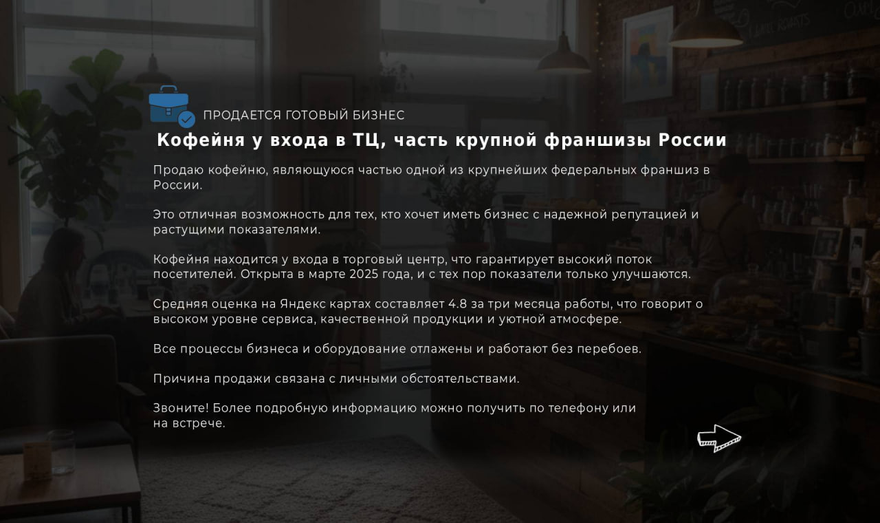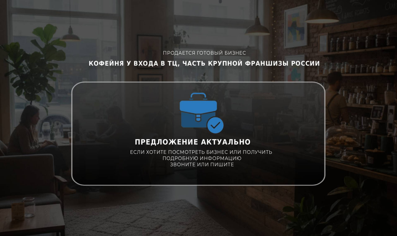 Оставьте заявку на просмотр бизнеса. Мы свяжемся с вами, чтобы подтвердить удобное для вас время и организовать подробную экскурсию с собственником.
