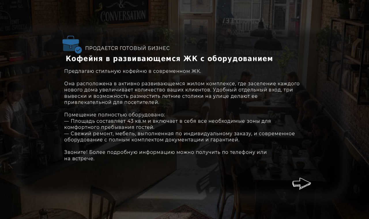 Оставьте заявку на просмотр бизнеса. Мы свяжемся с вами, чтобы подтвердить удобное для вас время и организовать подробную экскурсию с собственником.