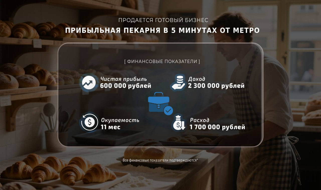 Вложив средства в пекарню, вы получите стабильный доход без дополнительных усилий и вложений с вашей стороны. Окупаемость составляет 11 месяцев.