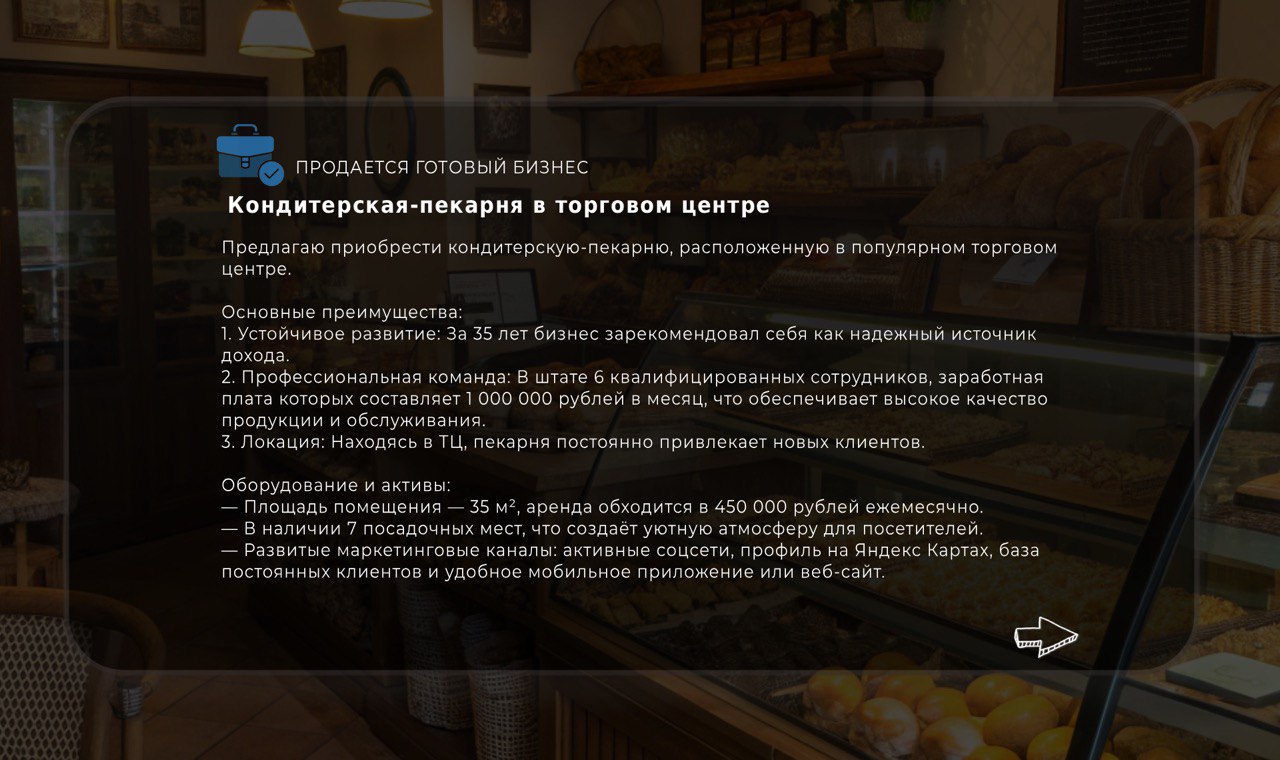 Оставьте заявку на просмотр бизнеса. Мы свяжемся с вами, чтобы подтвердить удобное для вас время и организовать подробную экскурсию с собственником.
