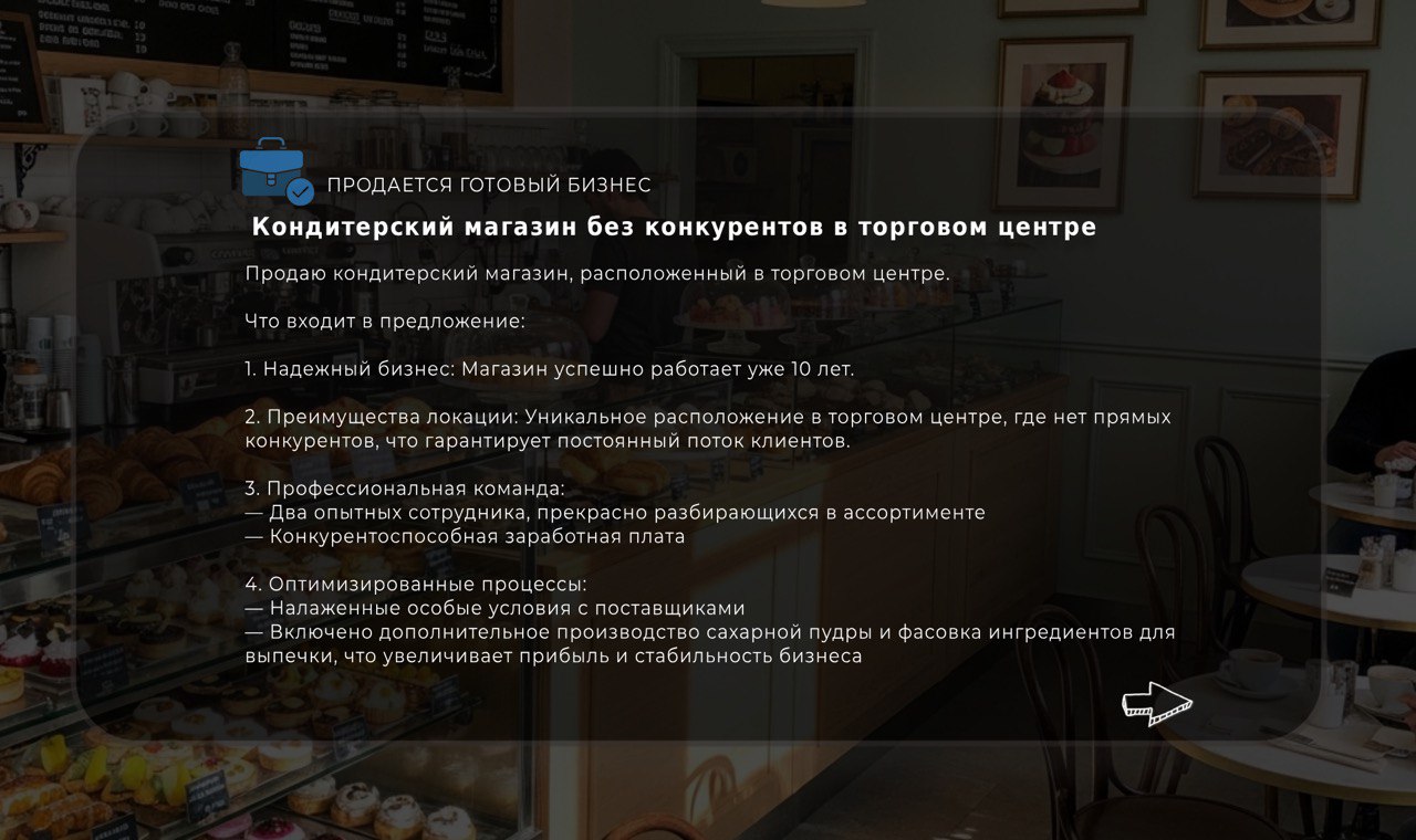 Оставьте заявку на просмотр бизнеса. Мы свяжемся с вами, чтобы подтвердить удобное для вас время и организовать подробную экскурсию с собственником.