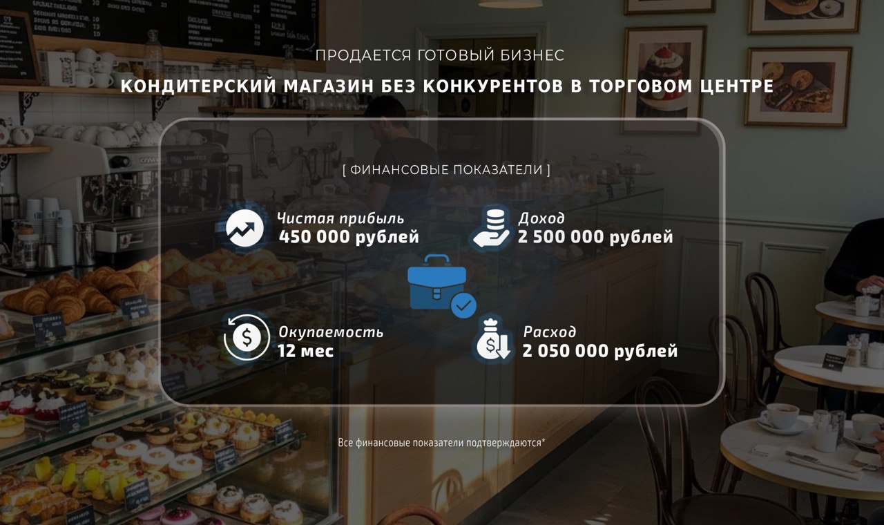 — Стоимость бизнеса: 5 500 000 рублей, включая товарный остаток на 3 000 000 рублей