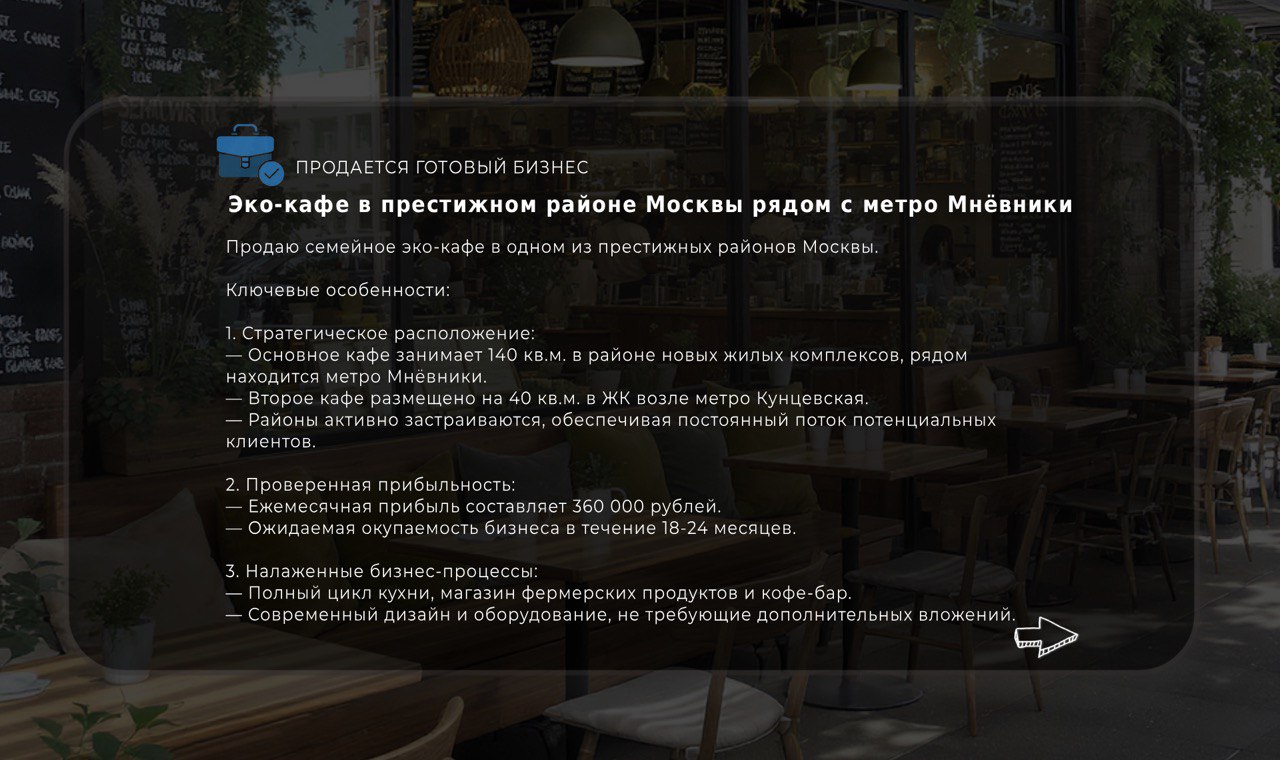 Оставьте заявку на просмотр бизнеса. Мы свяжемся с вами, чтобы подтвердить удобное для вас время и организовать подробную экскурсию с собственником.