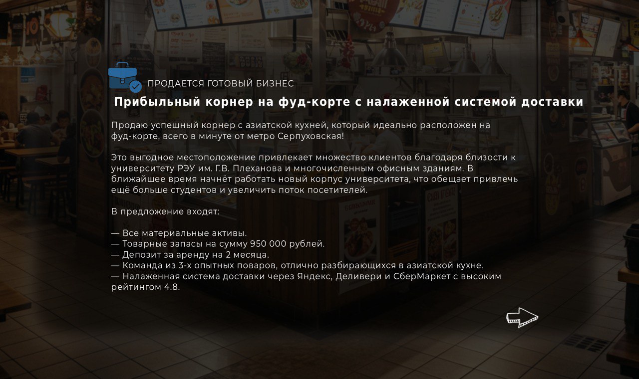 Продаю успешный корнер с азиатской кухней, который идеально расположен на фуд-корте, всего в минуте от метро Серпуховская!