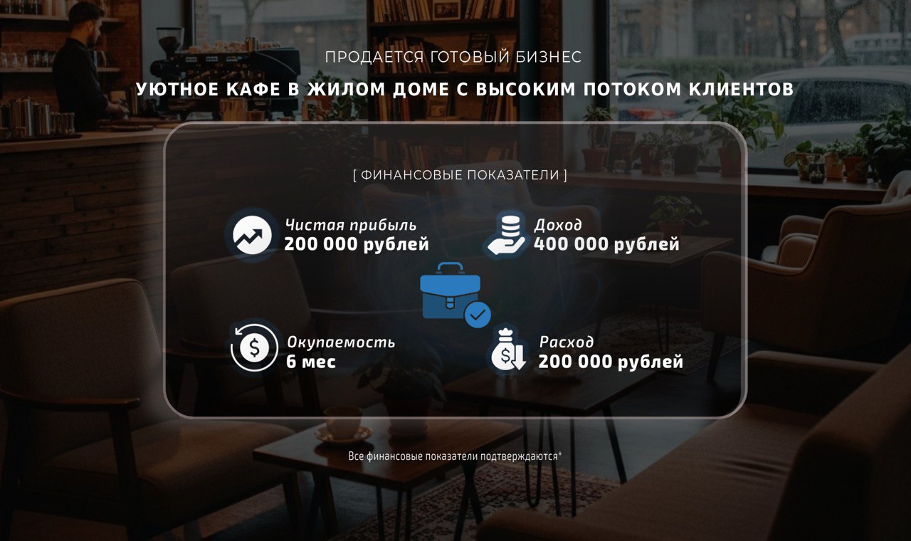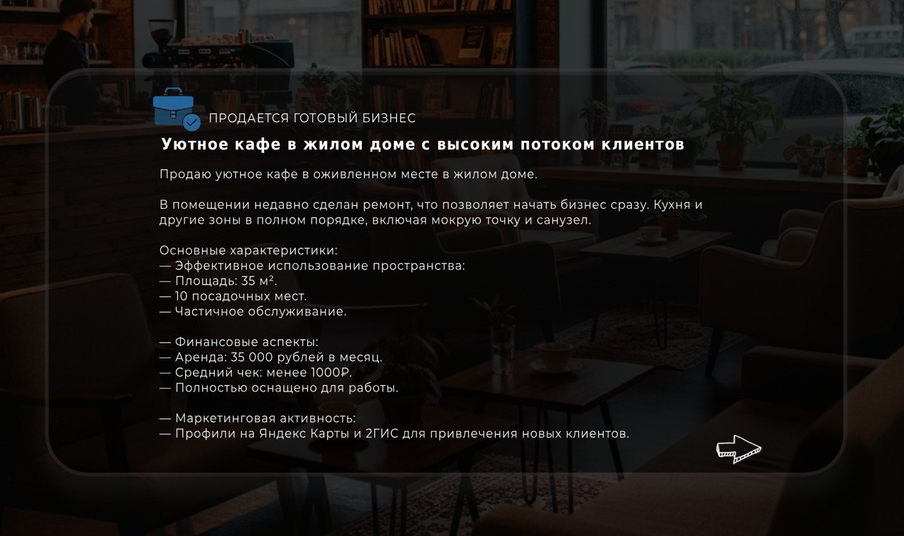Оставьте заявку на просмотр бизнеса. Мы свяжемся с вами, чтобы подтвердить удобное для вас время и организовать подробную экскурсию с собственником.
