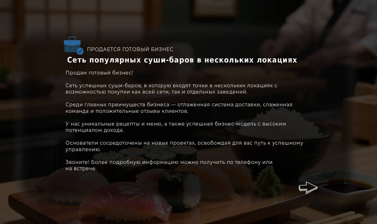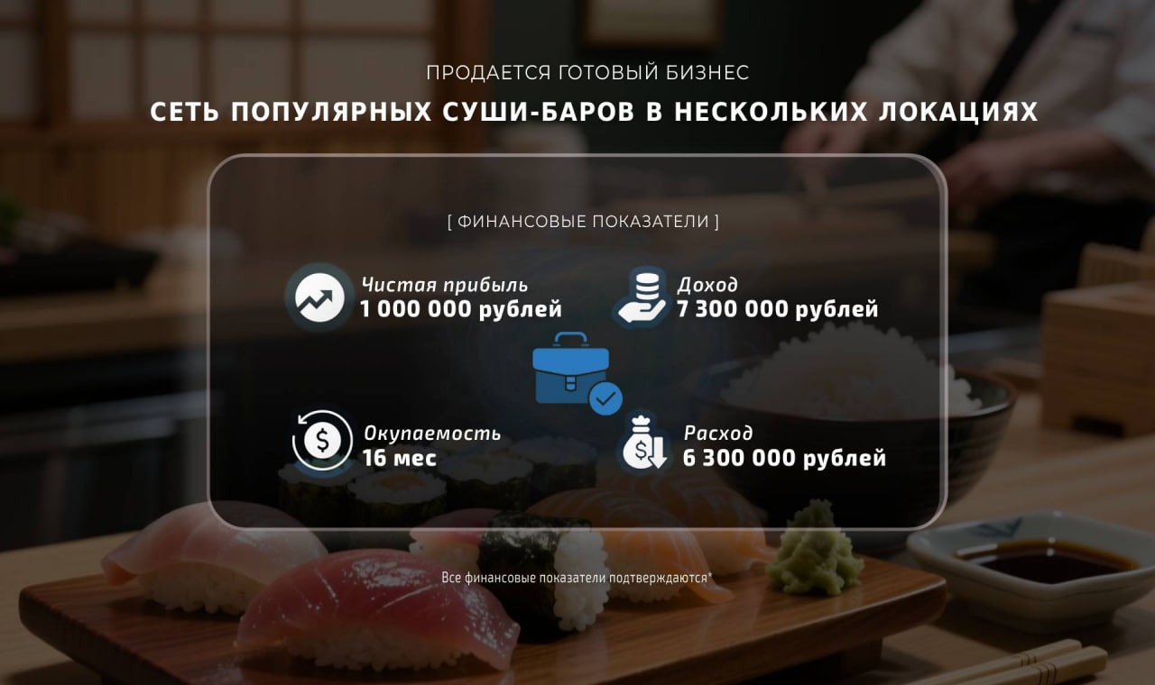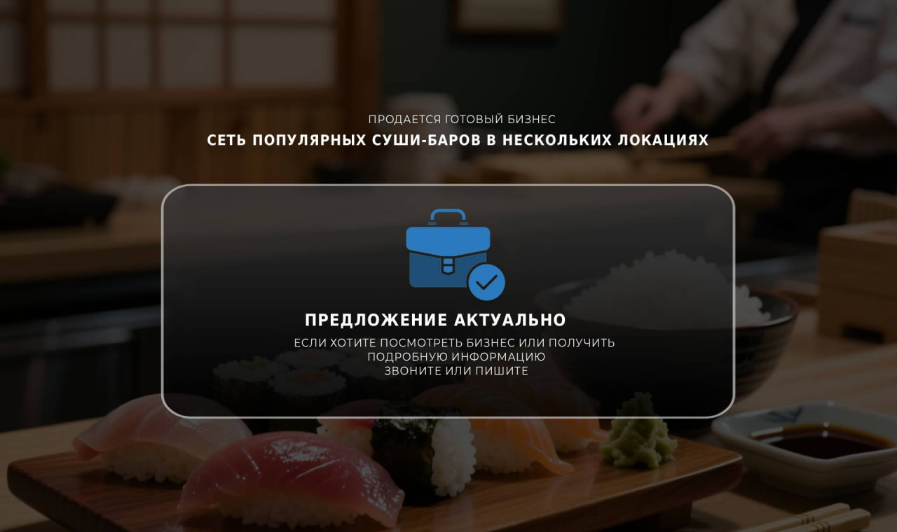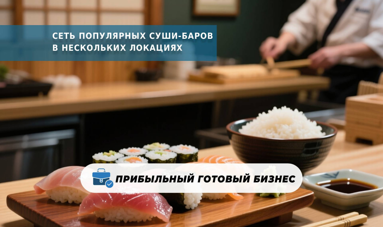 Сеть успешных суши-баров, в которую входят точки в нескольких локациях с возможностью покупки как всей сети, так и отдельных заведений.