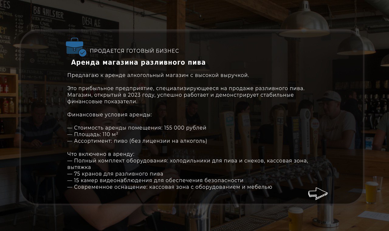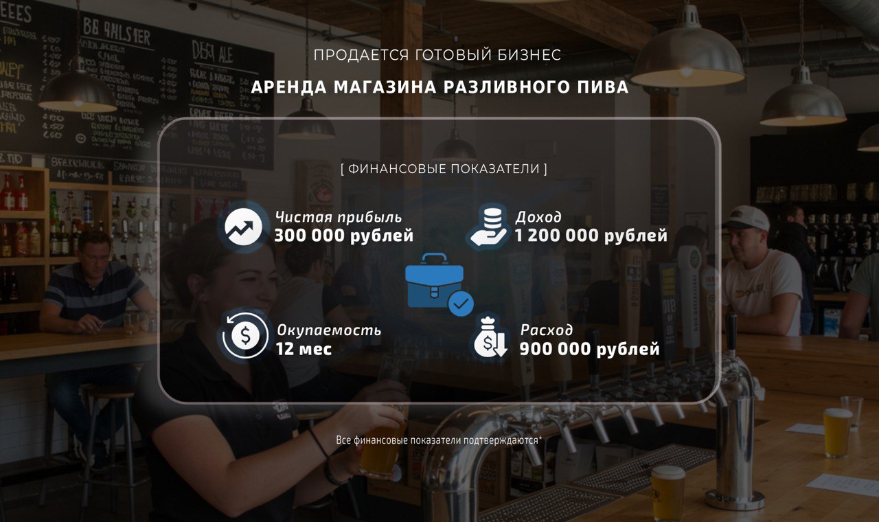 Это прибыльное предприятие, специализирующееся на продаже разливного пива. Магазин, открытый в 2023 году, успешно работает и демонстрирует стабильные финансовые показатели.