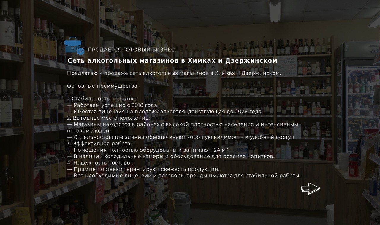Предлагаю к продаже сеть алкогольных магазинов в Химках и Дзержинском.