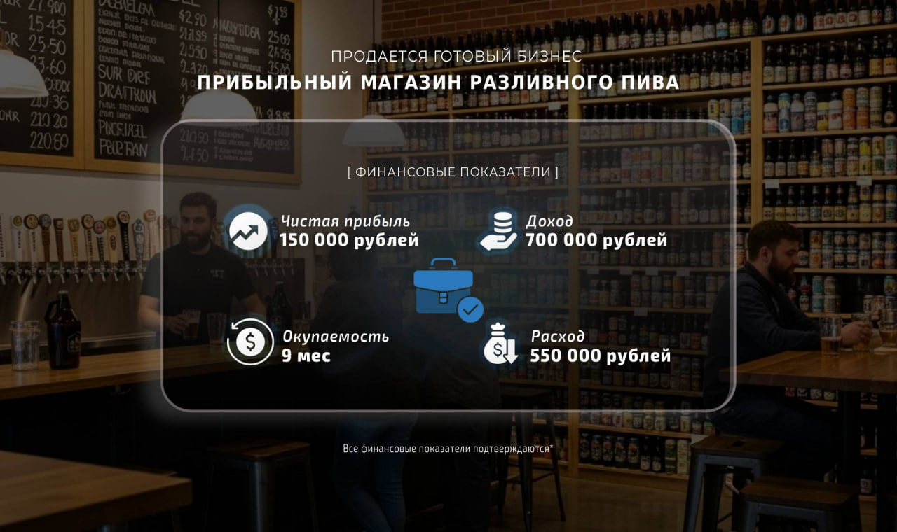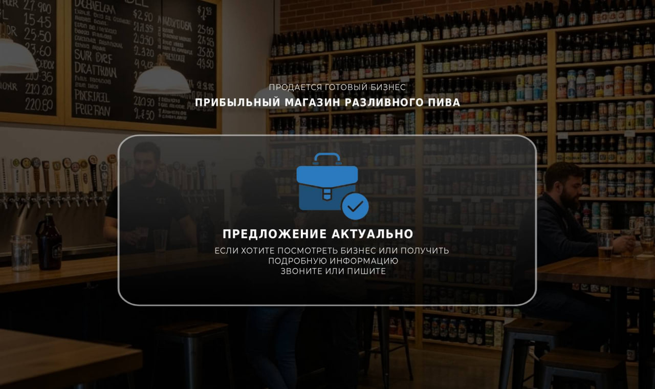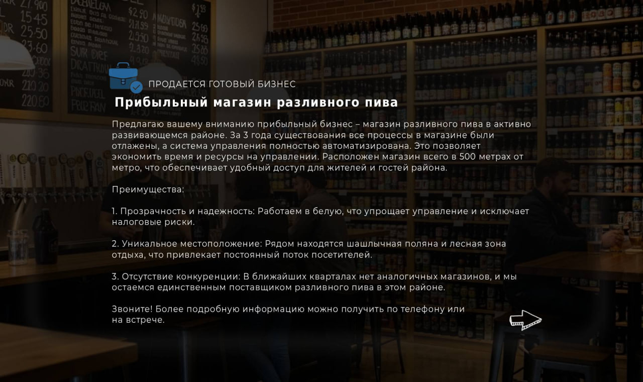 Предлагаю вашему вниманию прибыльный бизнес – магазин разливного пива в активно развивающемся районе. За 3 года существования все процессы в магазине были отлажены, а система управления полностью автоматизирована. Это позволяет экономить время и ресурсы на управлении. Расположен магазин всего в 500 метрах от метро, что обеспечивает удобный доступ для жителей и гостей района.