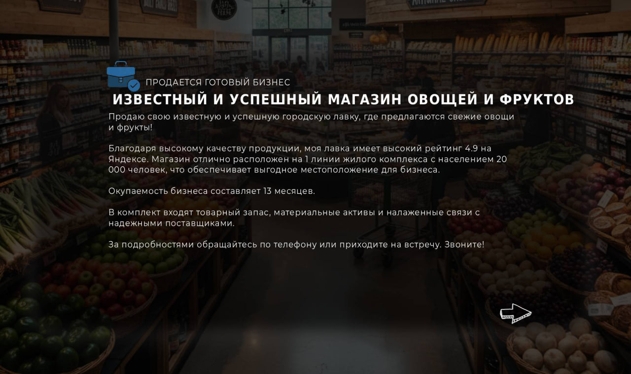 Продаю свою известную и успешную городскую лавку, где предлагаются свежие овощи и фрукты!