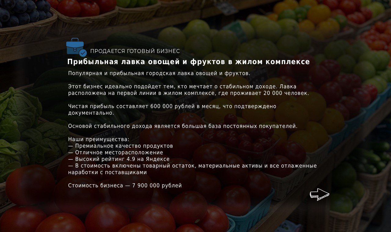 Оставьте заявку на просмотр бизнеса. Мы свяжемся с вами, чтобы подтвердить удобное для вас время и организовать подробную экскурсию с собственником.