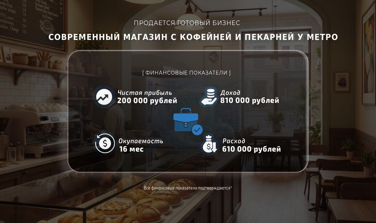 Финансовые показатели: среднемесячная выручка составляет 810 000 рублей, расходы — 610 000 рублей, и средняя чистая прибыль составляет 200 000 рублей. Окупаемость бизнеса составляет 16 месяцев.