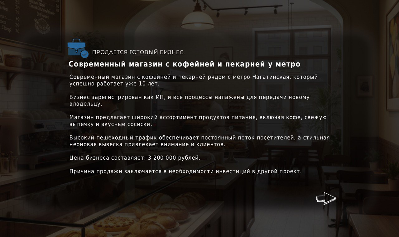 Оставьте заявку на просмотр бизнеса. Мы свяжемся с вами, чтобы подтвердить удобное для вас время и организовать подробную экскурсию с собственником.