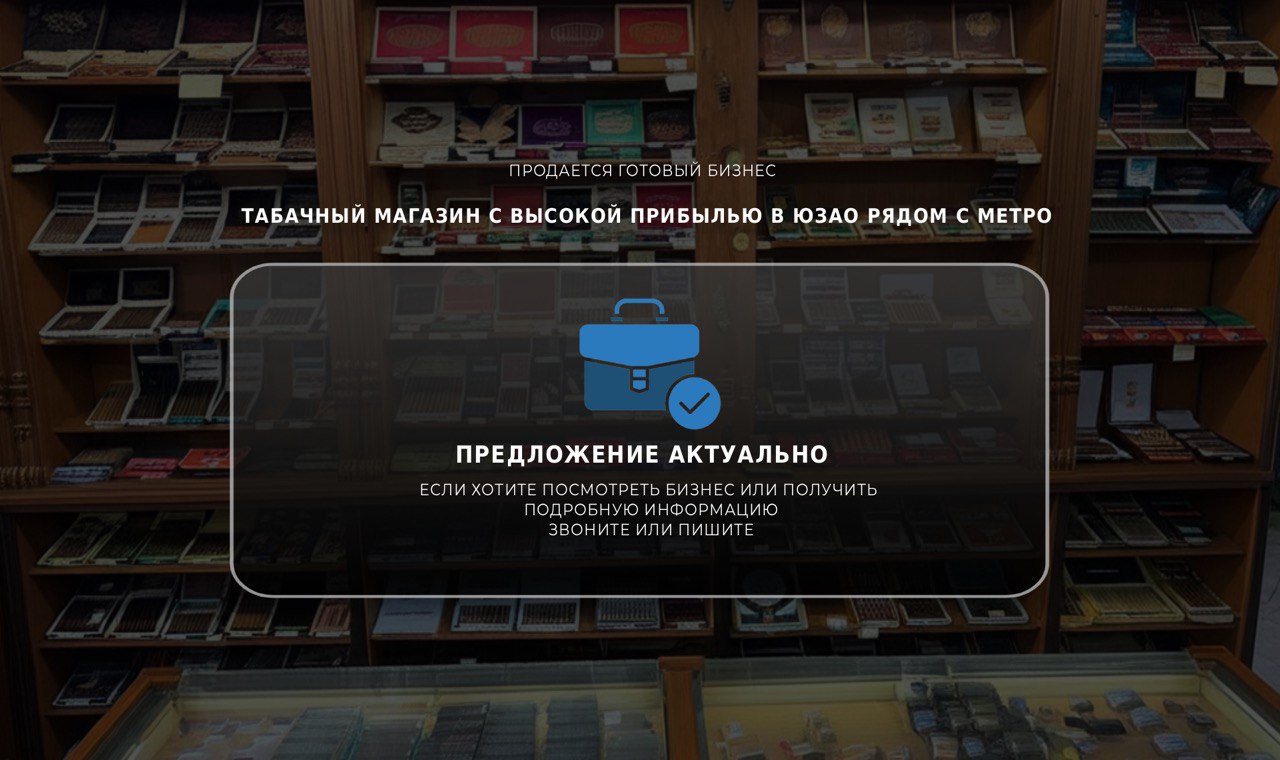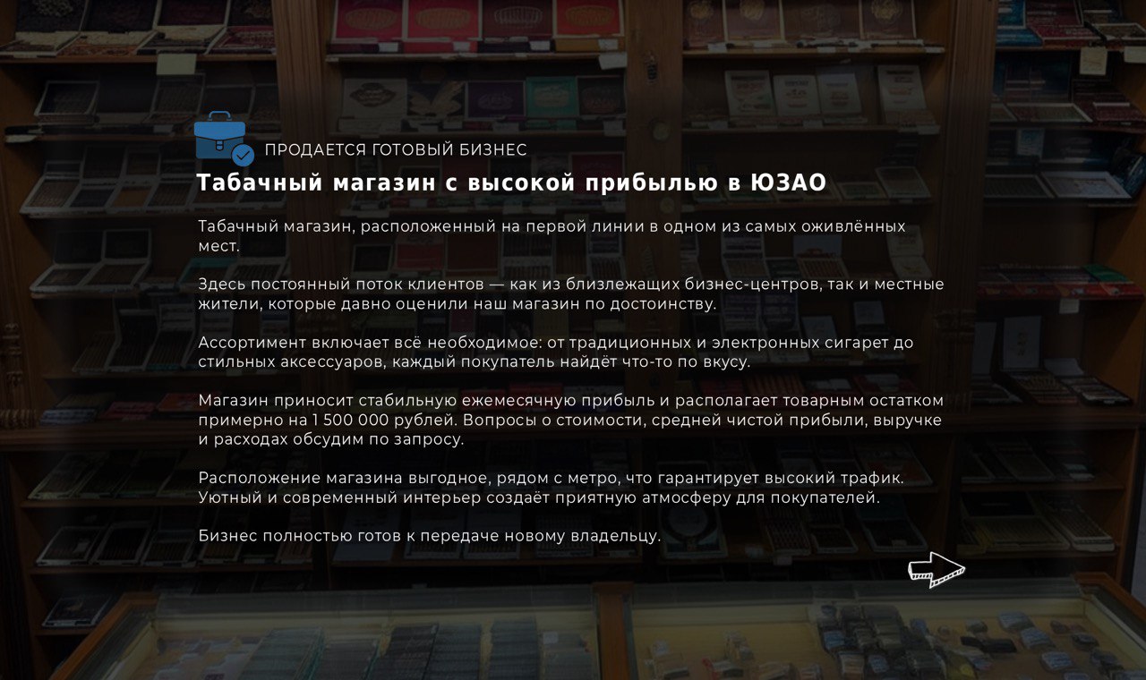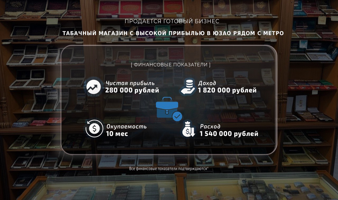 Табачный магазин, расположенный на первой линии в одном из самых оживлённых мест.
