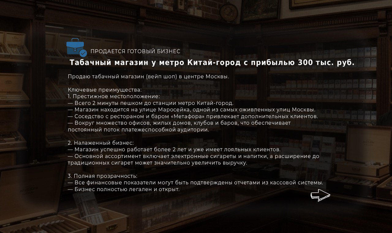 Если вы ищете стабильный и доходный бизнес в центре столицы, это предложение может вас заинтересовать.