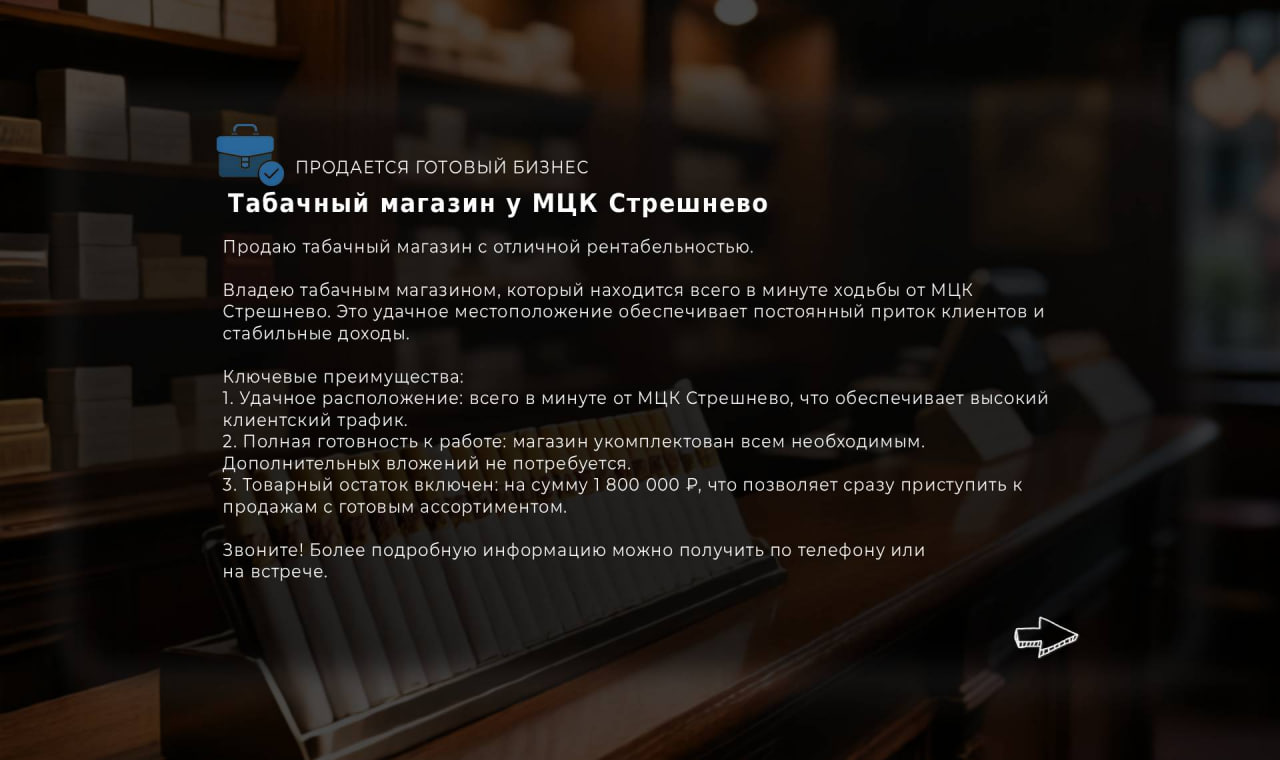 Владею табачным магазином, который находится всего в минуте ходьбы от МЦК Стрешнево. Это удачное местоположение обеспечивает постоянный приток клиентов и стабильные доходы.
