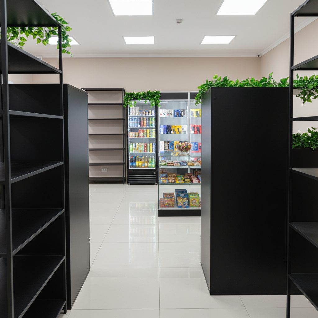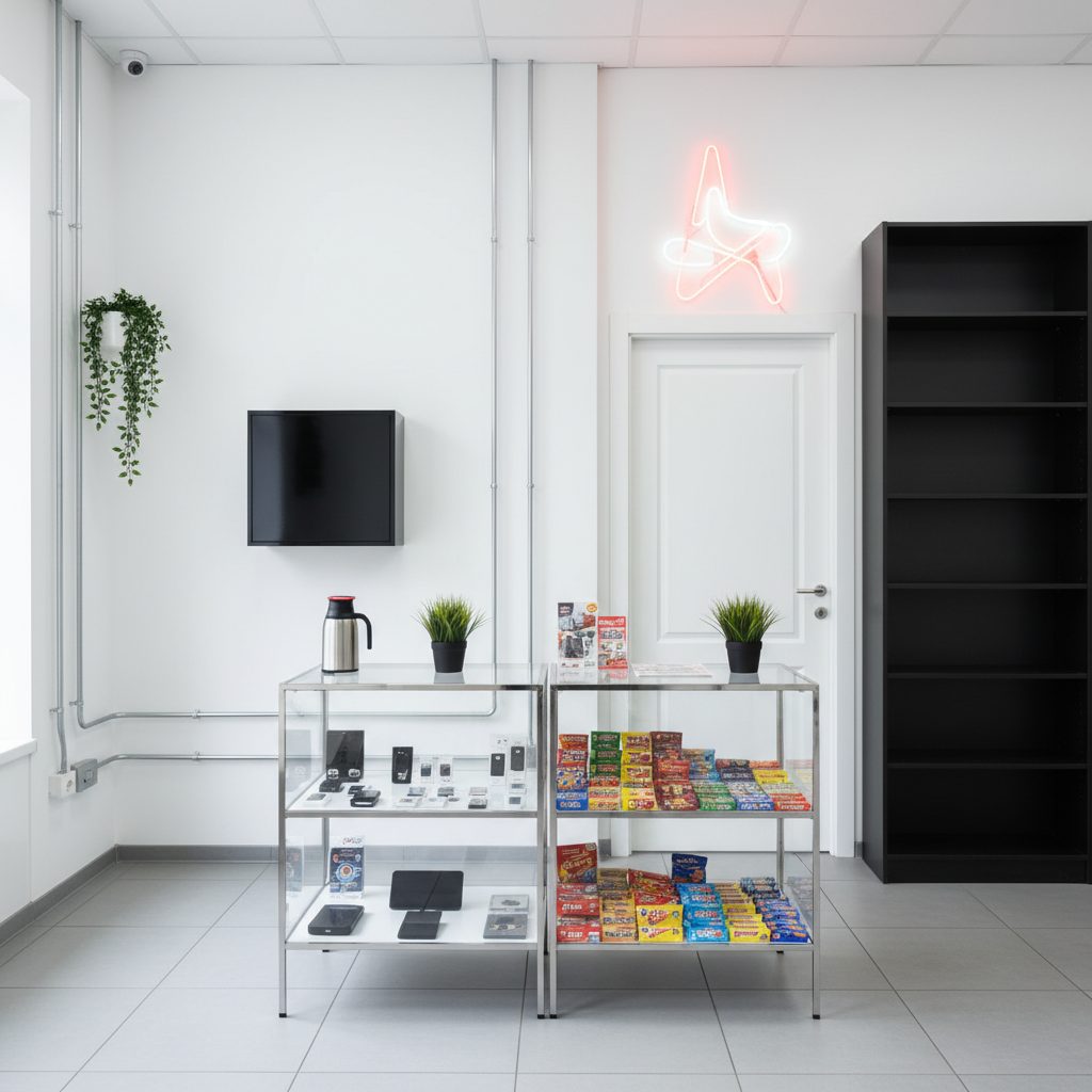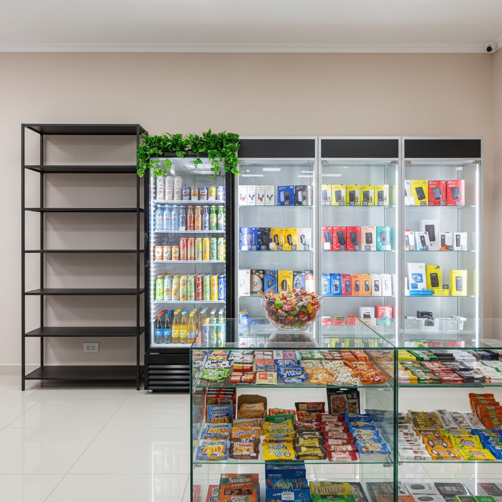 Магазин находится в Москве, в оживленном районе с высокой проходимостью от 300 до 400 человек в день. Площадь помещения составляет 23 кв.м. Внутри установлены 5 шкафов для табачной продукции, большая витрина, шкаф для сигарет, холодильник для напитков и стеллажи для снеков. Также имеется санузел. Рядом находятся популярные магазины и пункты выдачи заказов.