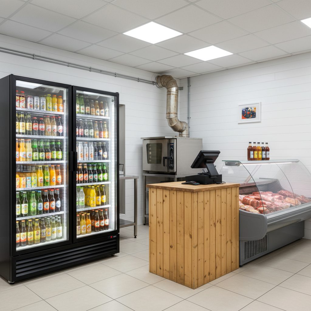 Магазин расположен в удобном месте, площадь составляет 150 кв.м. Включает в себя более 10 холодильников, морозильники, печки для выпечки, микроволновую печь, полки и столы. Также имеется отдельная комната с диваном и телевизором. Все оборудование и мебель остаются при продаже.