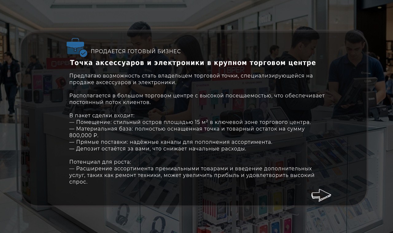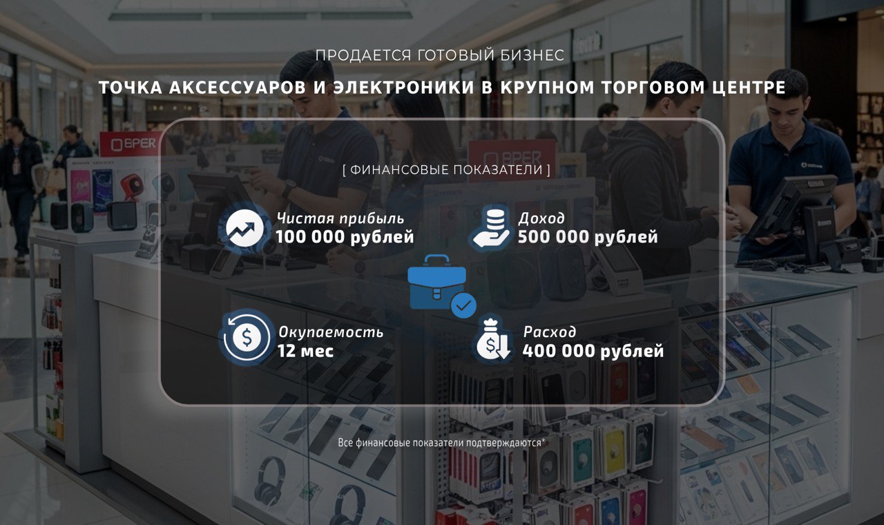 Предлагаю возможность стать владельцем торговой точки, специализирующейся на продаже аксессуаров и электроники.