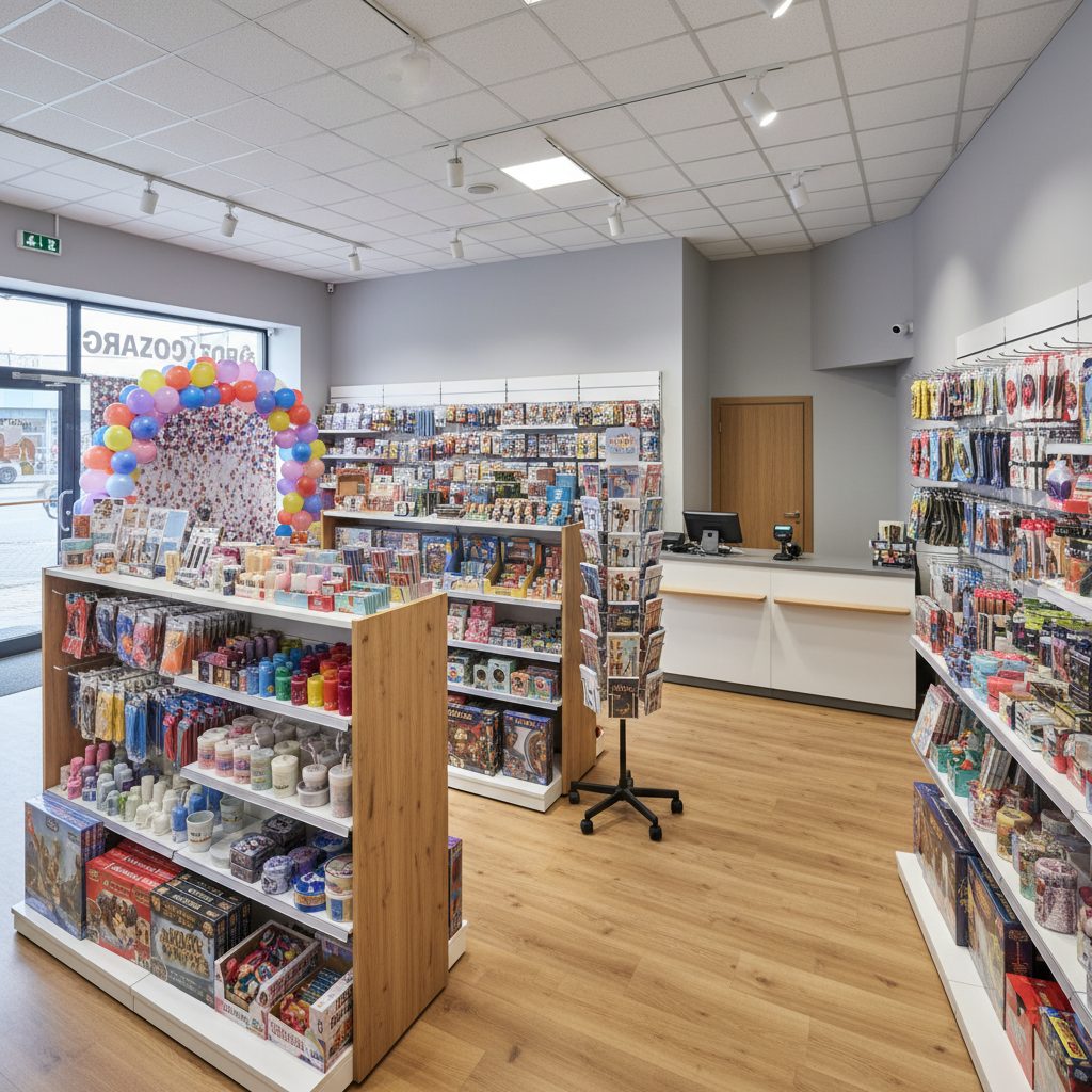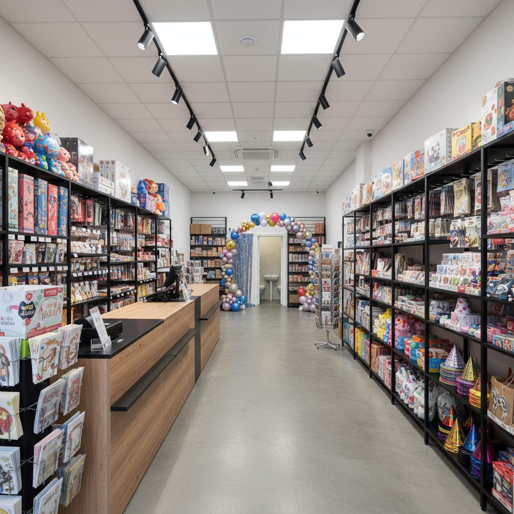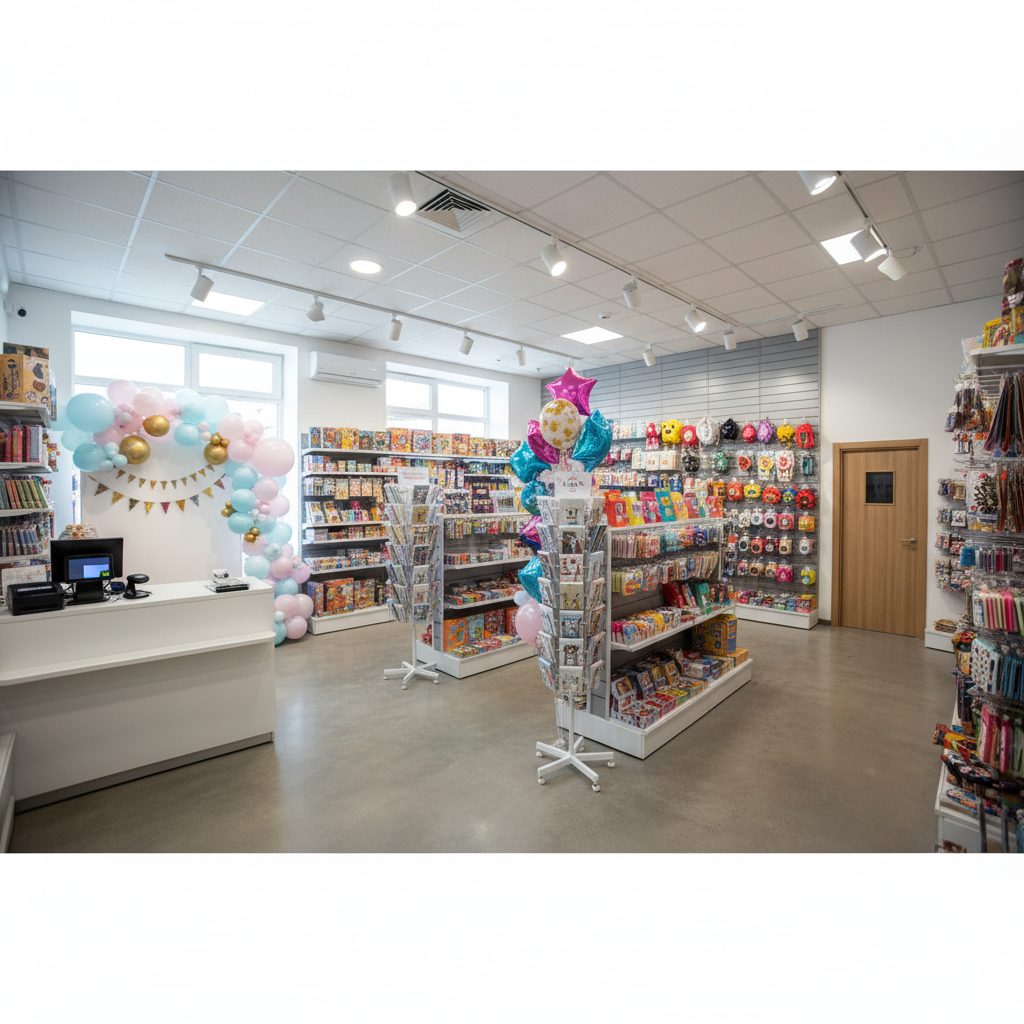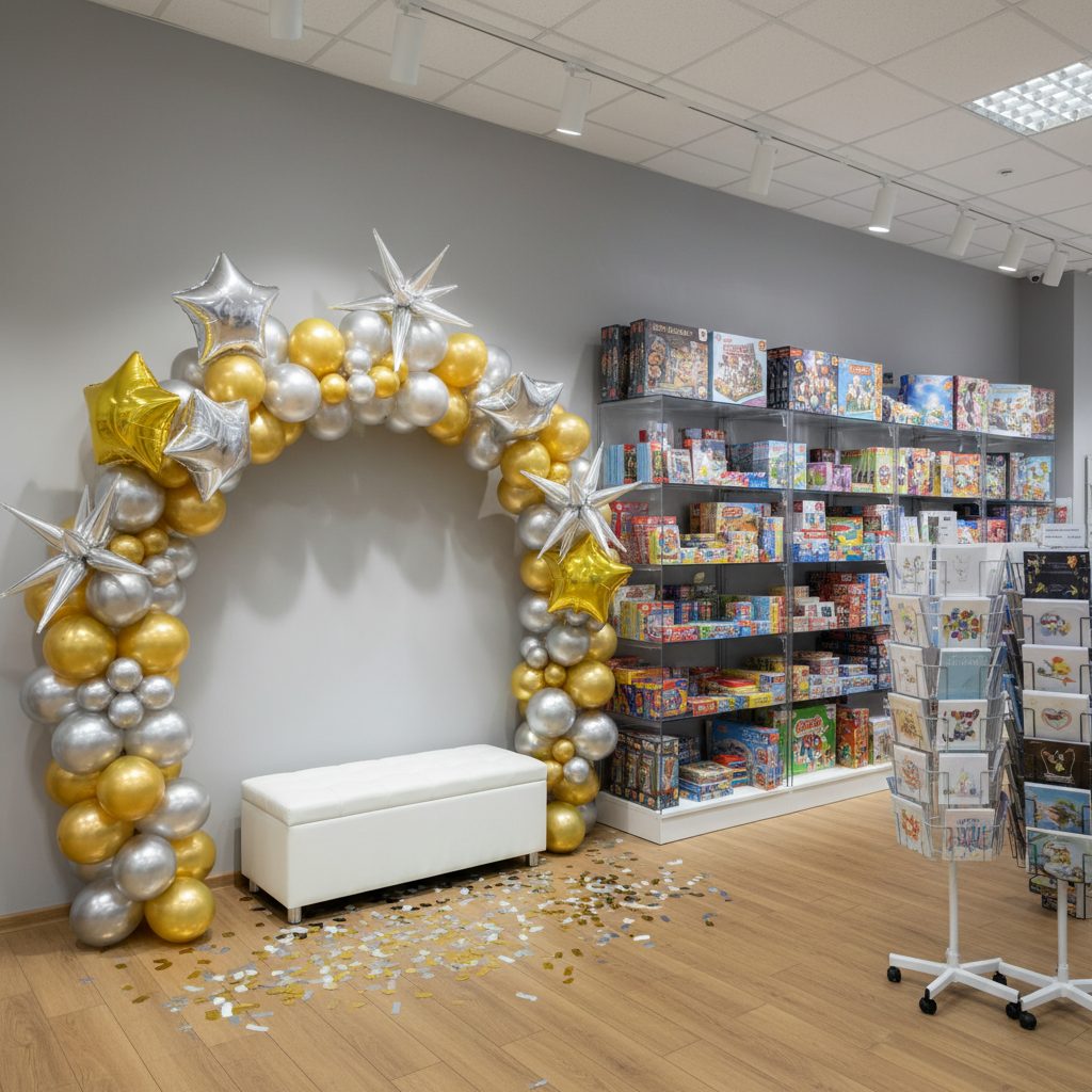 Ассортимент включает латексные и фольгированные шары, свечи, игры, игрушки, открытки, упаковку и карнавальную продукцию. Конкуренции в округе практически нет.