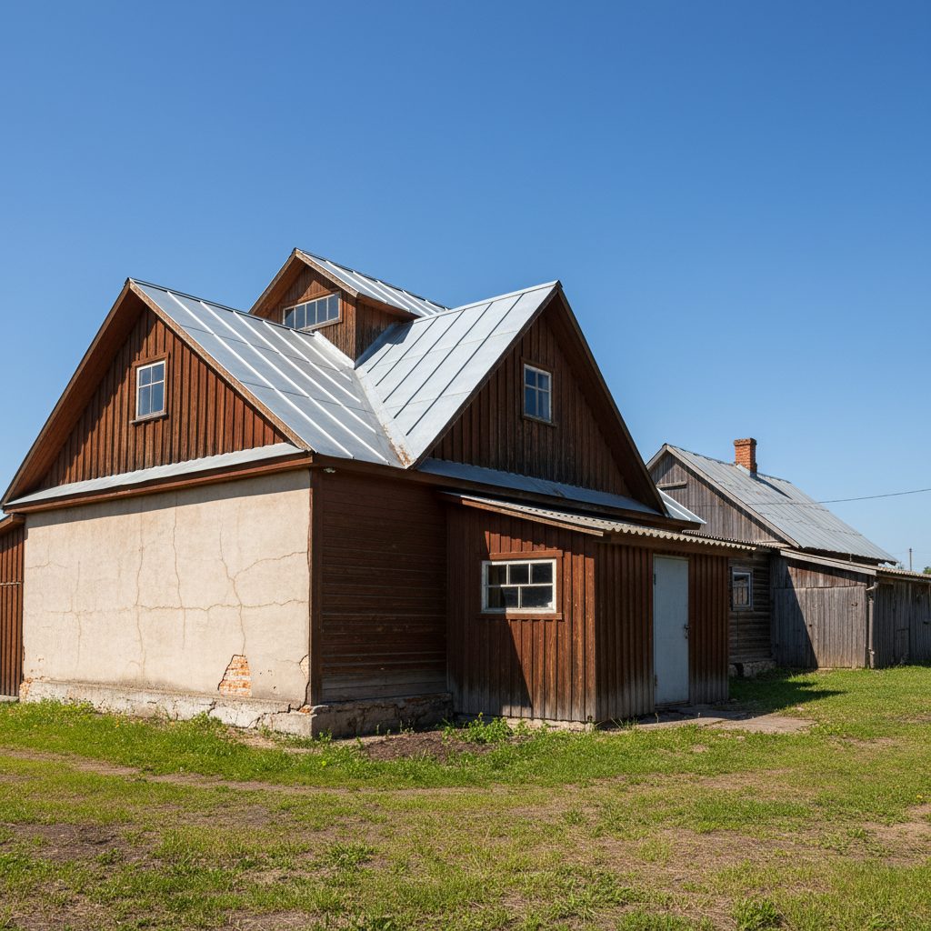 На участке находится кирпичный жилой дом площадью 119,2 м² с мансардой и подвалом, деревянный дом 27,7 м², который можно использовать для персонала или гостей, а также кирпичный гараж/хлев, готовый для содержания животных или хранения кормов. Дополнительно имеется баня с закрытой верандой. Участок ухоженный, ровный, с газоном и местом для посадок или пастбища.